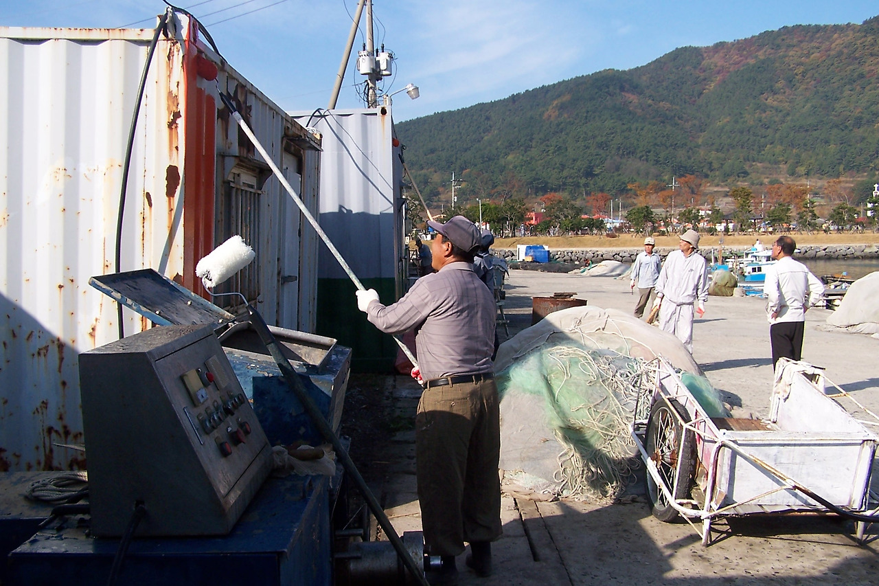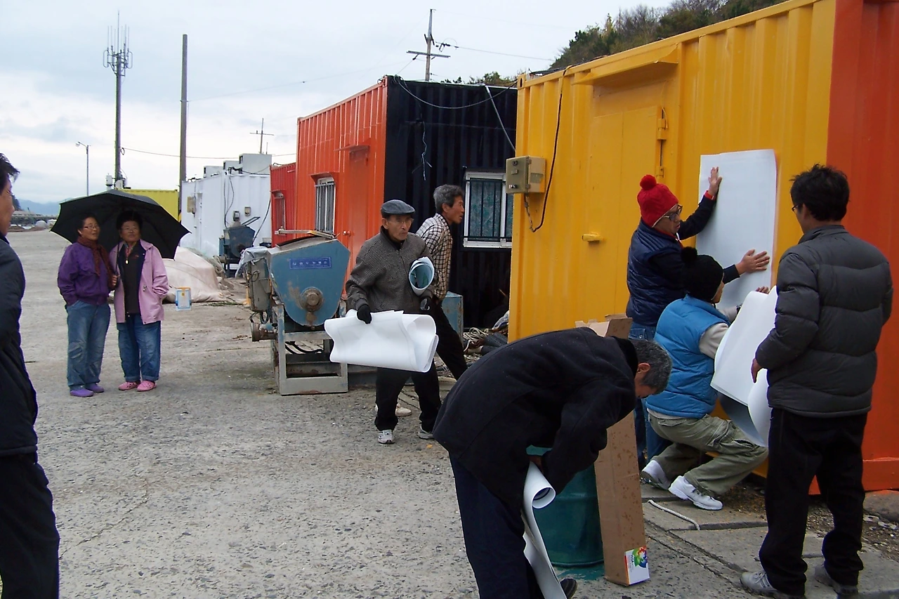 냉동고는 평면이 아닌 요철이라 글을 쓰기는 힘들고 시간도 많이 걸려 시화부분은 필름 작업으로 대체하고 냉동고 무지개 색깔은 마을 어른들이 직접 2주간 걸쳐 칠했다. 그렇게 오래 걸린 것은 아침이면 이슬이 내려 습기로 인하여 오전 작업은 못하고 오후에만 작업했기 때문이다. 그래도 공동 작업에 갓 잡아온 낙지와 문어를 쓸어 소주한잔의 새참은 꿀맛이고 변해가는 냉동고의 무지개색은 마을의 희망이었다.