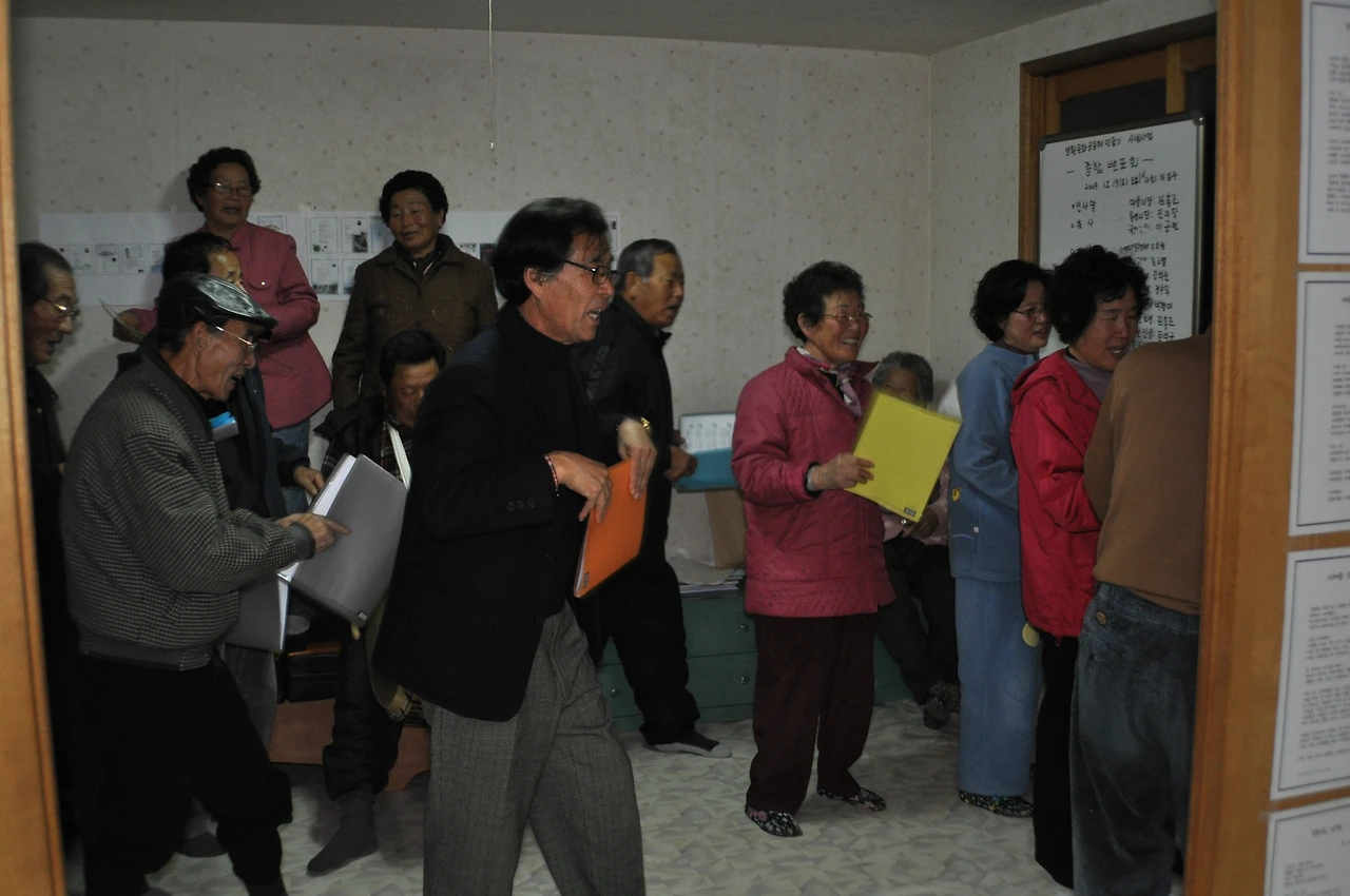 첫모임날 마을이장님을 찾아 마을방송을 부탁하고 마을노인정에 30명의 7,80대의 할아버지 할머니들이 모였다.