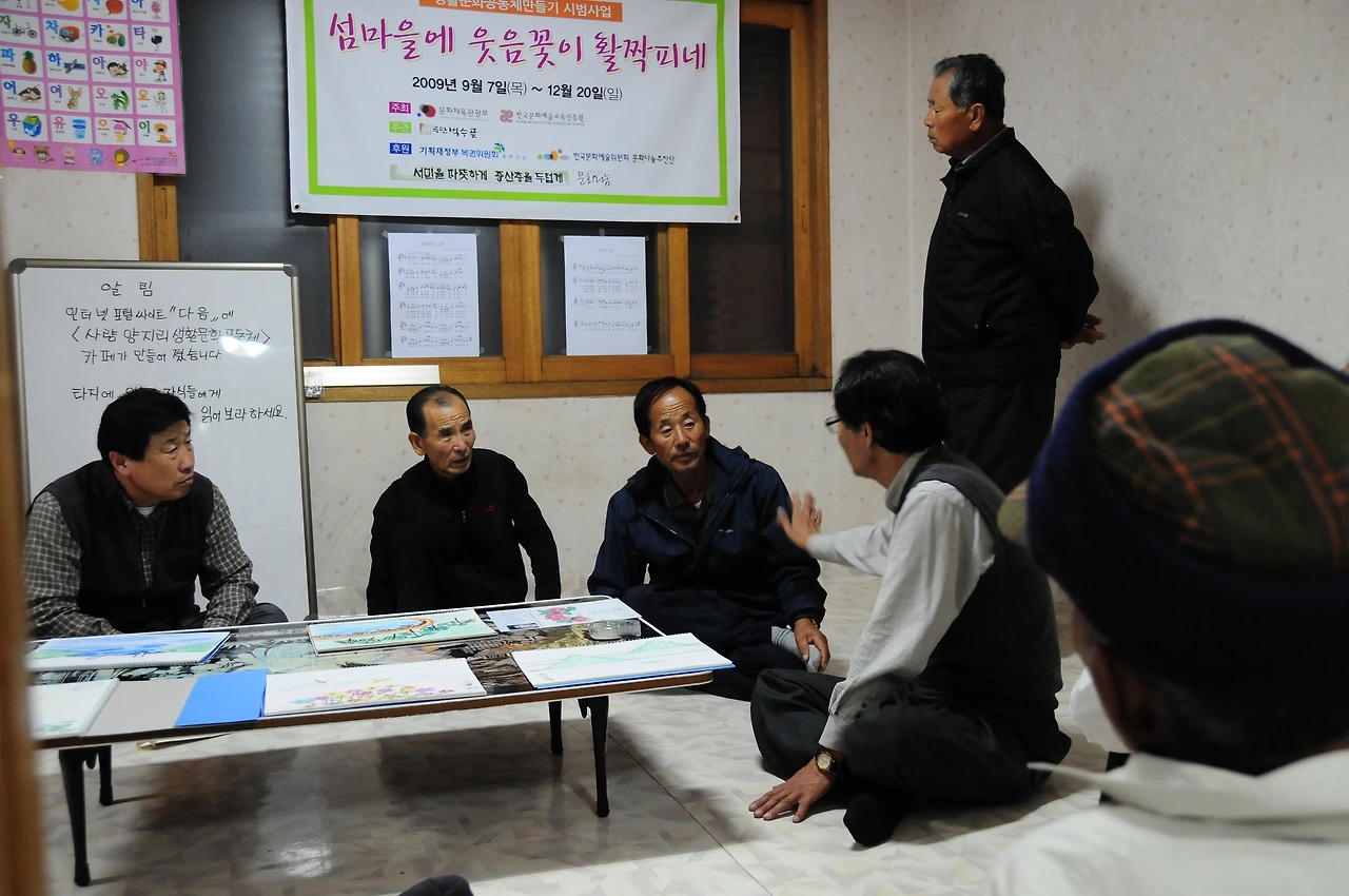 비니를 쓴 남자 한명이 다가와 필자에게 물었다. 필자는 흔쾌히 담배 한 대를 건넸다. 그는 담배를 입에 물며 “끊었던 담배가 다 피고 싶네요.” 말을 보탰다. 먹먹한 감동을 느낀 것은 필자만이 아닌 듯했다. 주민 60여 명의 섬마을에 생활문화공동체 시범사업이 시작되고 사람들은 시를 짓고 시화를 붙이고, 시극을 연습하며 두 계절을 보냈다. 그들의 삶과 두 계절의 시간이 온몸으로 부딪쳐온 것이리라.
