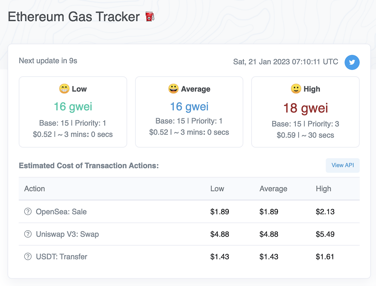 추가로 이더스캔을 더 잘 활용하는 방법에 대해서 잠깐 말하면, 이더스캔에서 "Ethereum Gas Tracker"를 사용하면 현재 시점에서의 대략의 "Gas Fee"를 확인할 수 있다. 메타마스크를 비롯한 지갑에서 특별히 거래 속도를 빠르게 하는 설정을 하지 않았다면, Average에 해당하는 "Gas Fee"가 나온다고 생각하면 된다.