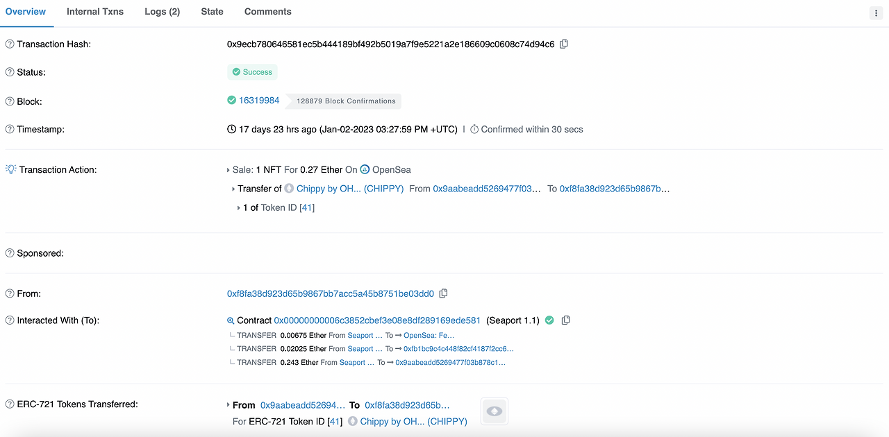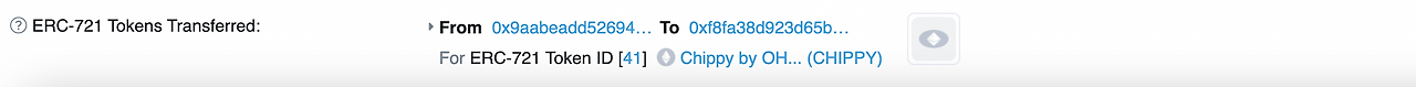 첫째로 NFT가 OpenSea에서 0.27 ETH에 거래가 되었다는 걸 알 수 있다. 이더스캔에서 식별이 가능한 유명한 마켓플레이스의 경우에는 어느 곳에서 거래했는지까지 알 수 있다. 만약 이더스캔에서 식별이 불가능한 마켓플레이스에서 일어난 거래의 경우에는, NFT 이동 내역만 나온다. 그리고 이동한 NFT의 이름은 CHIPPY이고, 0x9aa... 지갑에서 0xf8f... 지갑으로 이동했다는 걸 알 수 있다. 41번 토큰 아이디 NFT 1개가 이동한 것을 볼 수 있다. 2개 이상의 NFT가 한 번에 이동해도, 모든 NFT의 토큰 아이디를 볼 수 있다. 토큰 아이디는 NFT 이름에 붙어 있는 숫자 번호로 이해하면 된다.