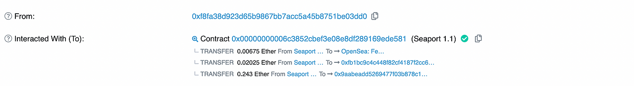 "From", "Interacted With (To)" 섹션은 트랜잭션이 일어나는 과정에서의 ETH 이동 흐름을 나타낸 부분이다. "From"은 ETH의 시작점이다. NFT를 구매한 사람으로 이해하면 된다. 보통 OpenSea 등 마켓플레이스에서 NFT를 거래할 경우, ETH는 보통 여러 지갑으로 이동한다. 첫째, NFT를 구매한 지갑으로 가장 많은 ETH가 이동한다. 그 뒤, Creator Loyalty에 따라 일정 비율의 ETH가 NFT 창작자에게로 이동한다. 마지막으로 수수료에 해당하는 ETH가 마켓플레이스로 이동한다.