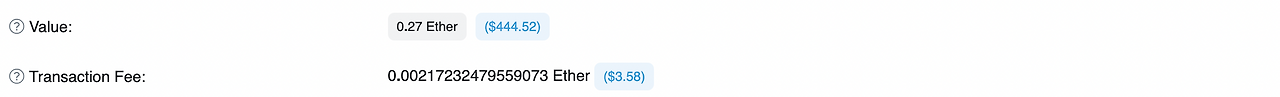 "Value" 섹션은 NFT가 단순 전송이 아닌 거래의 경우, 거래 금액을 나타내는 부분이다. "Value" 섹션 아래의 "Transaction Fee"는 흔히 우리가 아는 거래가 일어날 때 발생한 가스비(Total Gas Fee)를 나타낸 부분이다. 하단에 "Gas Price"라는 섹션이 있어서 헷갈릴 수도 있는데, Total Gas Fee(=Transaction Fee) = gas units (limit) x (base fee + tip)이다. 따라서 "Gas Price"에 속으면 안 된다.