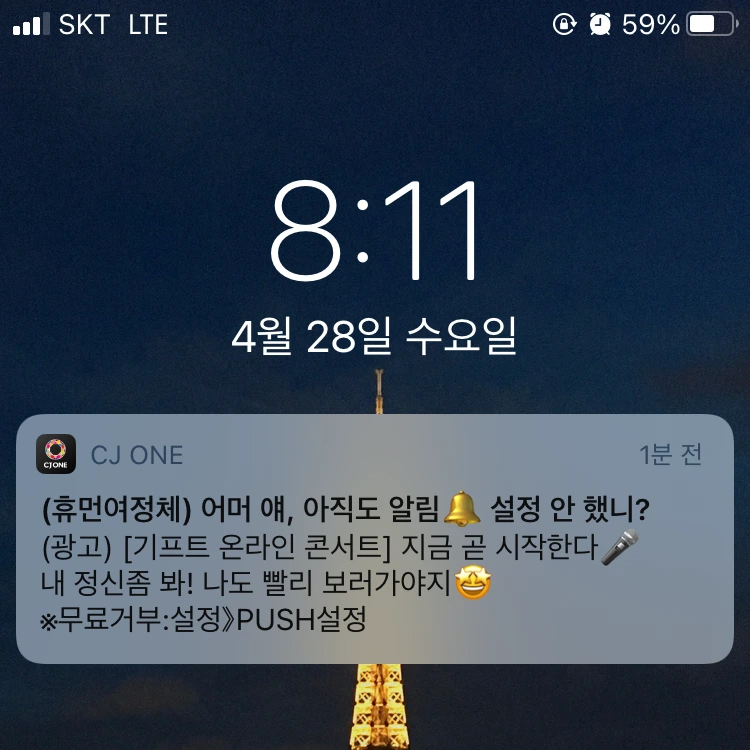 셋째로, '(광고)', '무료거부' 등의 문구가 휴먼여정체를 방해한다. 이것들은 광고성 앱 푸시를 보낼 때 어쩔 수 없는 부분이고, 이러한 문구들은 특정 컨셉이 주는 느낌을 약하게 만든다. 그렇기 때문에 차라리 휴먼여정체를 쓰지 말고, 평범하게 고객들이 얻을 수 있는 베네핏을 쓰는 게 더 낫지 않았을까 싶다.