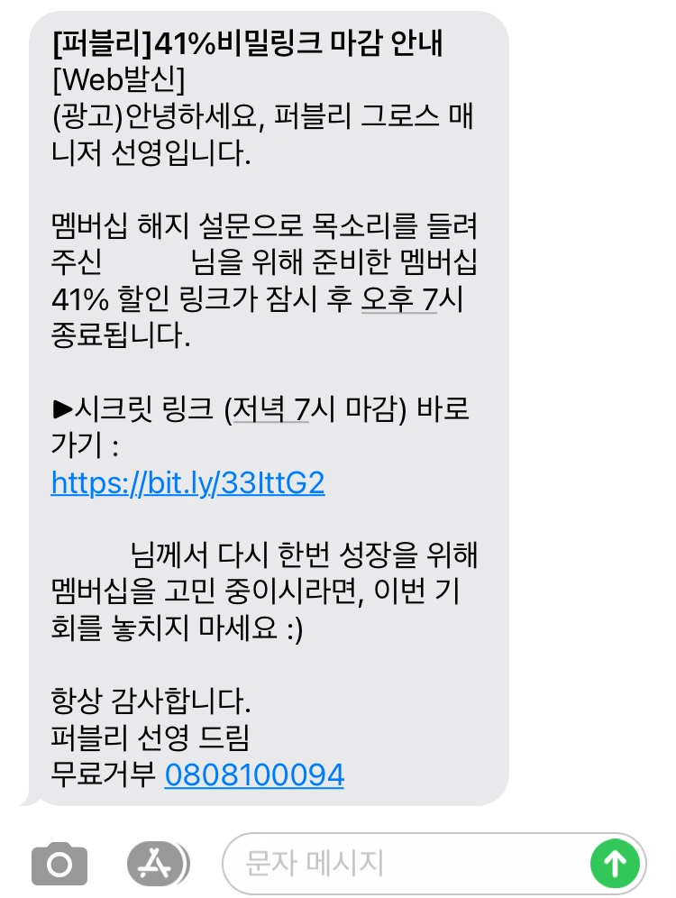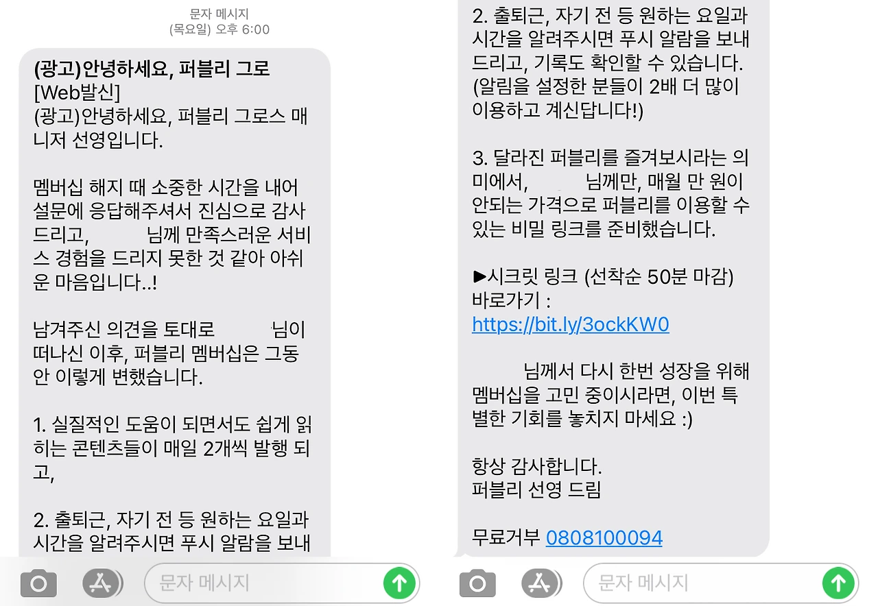 베어유 뿐 아니라 퍼블리에서도 프로모션 문자를 받았다. 바로 퍼블리 이탈 고객들(멤버십을 이용하다가 해지한 고객들)을 대상으로 할인을 제공하는 프로모션이었다. 문자 내용을 보니 전체 고객 중 나 같은 이탈 고객을 정확히 세분화해서 보냈다는 생각이 들었다. 퍼블리를 잘 이용하고 있는 고객들에게 "멤버십 해지 때 ~"라는 내용을 보내지는 않을테니까 말이다.