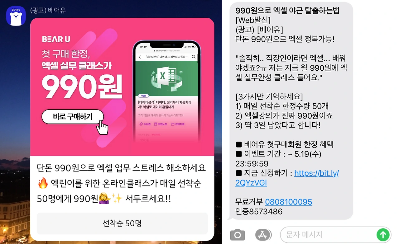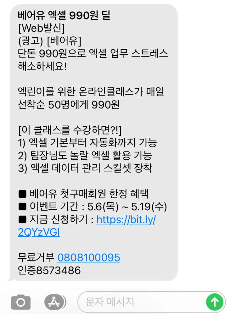 엑셀 첫 구매 990원 프로모션 문자를 받은 이후로, 동일한 내용의 DM을 두 번이나 더 받았다. 프로모션을 받는 고객 입장에서 또 프로모션을 보내는 마케터 입장에서 이 세 번의 프로모션 문자를 볼 때, '담당자의 프로모션에 대한 이해도가 높지 않다'는 생각이 들었다.