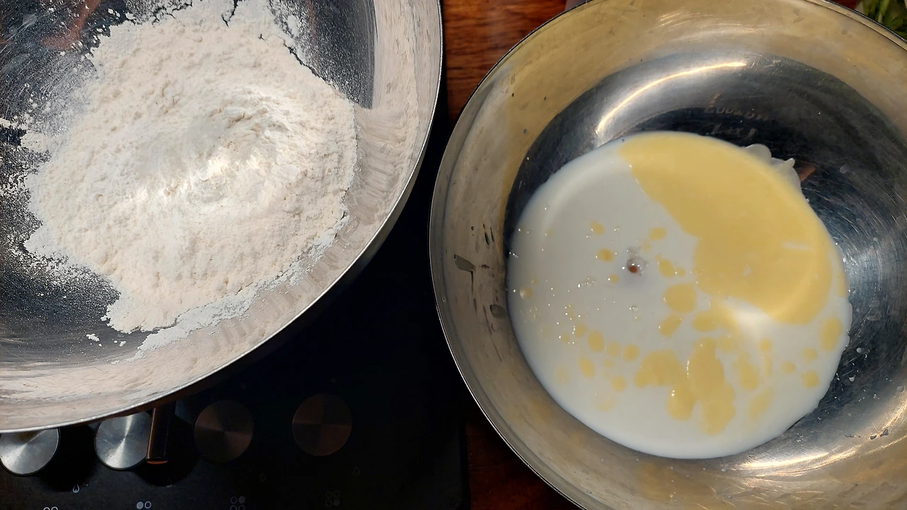 밀가루(100g):우유(250ml):버터(25g):달걀(2개)
