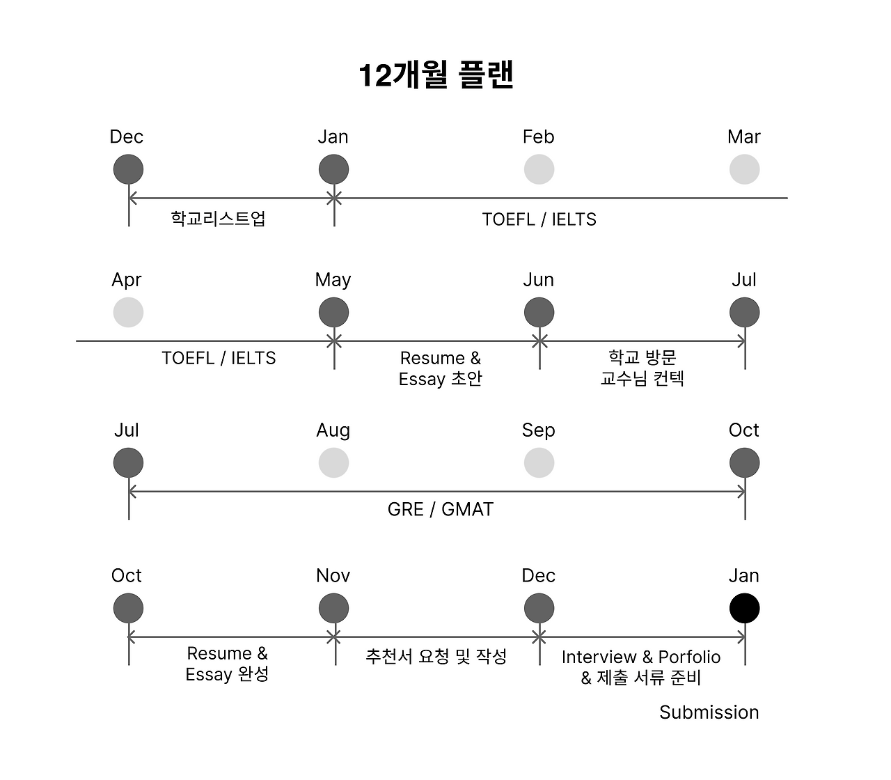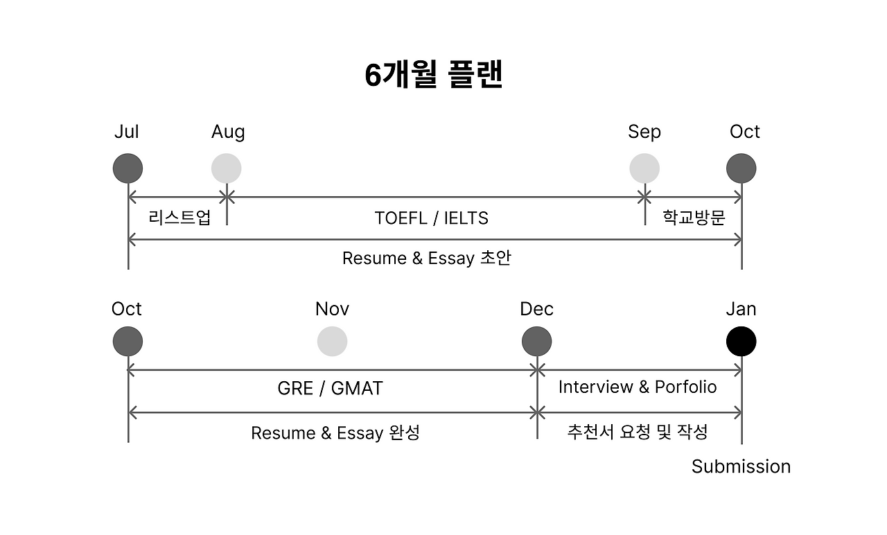 이렇게 전체 과정을 정리하고 보니 준비하는 데에 꼬박 12개월에 최소 500만 원 정도의 비용이 드네요. 하지만 벌써 시간이 별로 남지 않았다고 올해 지원을 단념할 필요까지는 없어요. 준비하는 각 단계들을 오버랩해서 인텐스 하게 줄이면 6개월 만에도 가능하다고 생각합니다. 제 경우 실제로 7월에 Toefl 준비를 시작해서 1월에 지원을 마감했습니다. 하지만 최선의 결과를 내기 위해 충분한 준비 시간을 가지려면 1년 정도의 여유를 두고 시작하는 것이 가장 바람직하니 해외 석사에 대한 관심이 생기고 있다면 연초부터 미리미리 준비하는 것을 추천드립니다.