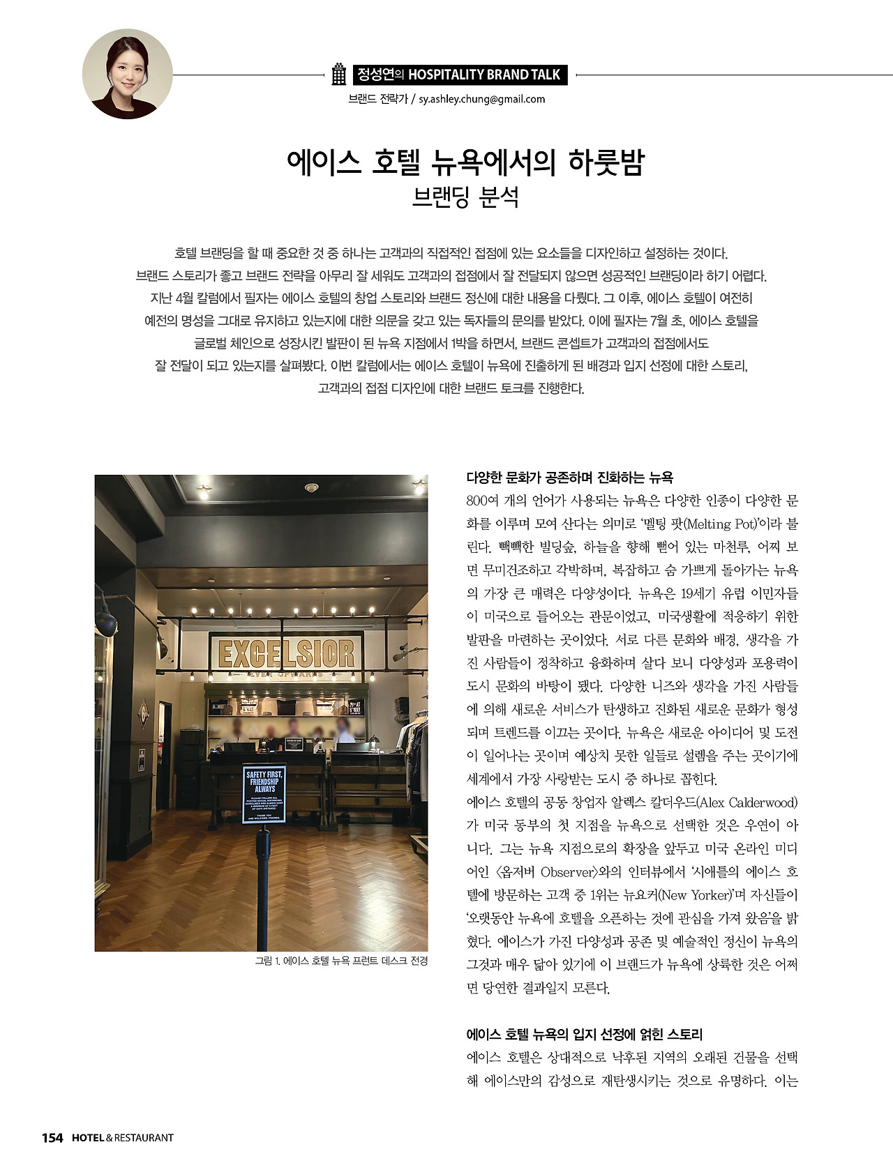 호텔 브랜딩을 할 때 중요한 것 중 하나는 고객과의 직접적인 접점에 있는 요소들을 디자인하고 설정하는 것이다. 브랜드 스토리가 좋고 브랜드 전략을 아무리 잘 세워도 고객과의 접점에서 잘 전달되지 않으면 성공적인 브랜딩이라 하기 어렵다. 지난 4월 칼럼에서 필자는 에이스 호텔의 창업 스토리와 브랜드 정신에 대한 내용을 다뤘다. 그 이후, 에이스 호텔이 여전히 예전의 명성을 그대로 유지하고 있는지에 대한 의문을 갖고 있는 독자들의 문의를 받았다. 이에 필자는 7월 초, 에이스 호텔을 글로벌 체인으로 성장시킨 발판이 된 뉴욕 지점에서 1박을 하면서, 브랜드 콘셉트가 고객과의 접점에서도 잘 전달이 되고 있는지를 살펴봤다. 이번 칼럼에서는 에이스 호텔이 뉴욕에 진출하게 된 배경과 입지 선정에 대한 스토리, 고객과의 접점 디자인에 대한 브랜드 토크를 진행한다.