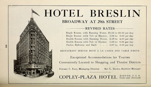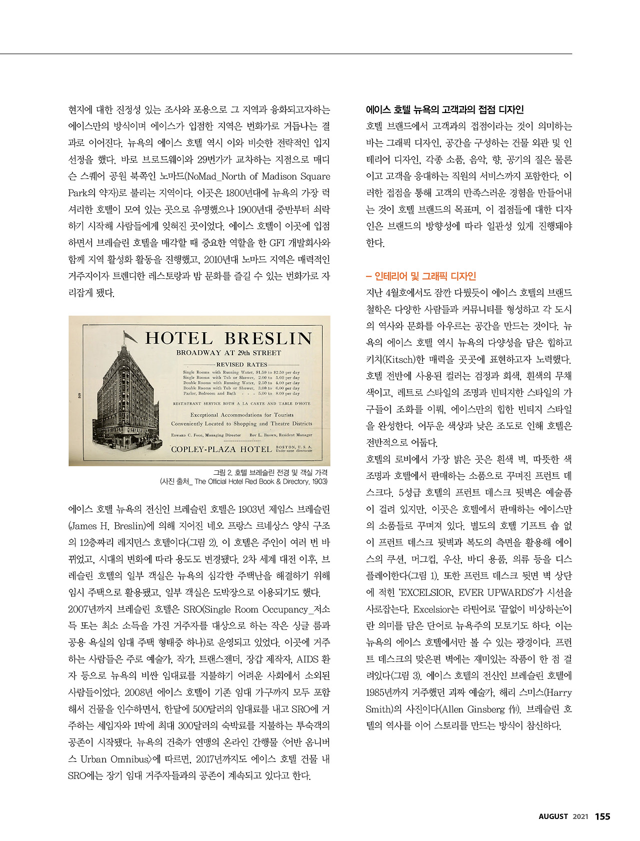 에이스 호텔 뉴욕의 전신인 브레슬린 호텔은 1903년 제임스 브레슬린(James H. Breslin)에 의해 지어진 네오 프랑스 르네상스 양식 구조의 12층짜리 레지던스 호텔이다(그림 2). 이 호텔은 주인이 여러 번 바뀌었고, 시대의 변화에 따라 용도도 변경됐다. 2차 세계 대전 이후, 브레슬린 호텔의 일부 객실은 뉴욕의 심각한 주택난을 해결하기 위해 임시 주택으로 활용됐고, 일부 객실은 도박장으로 이용되기도 했다.