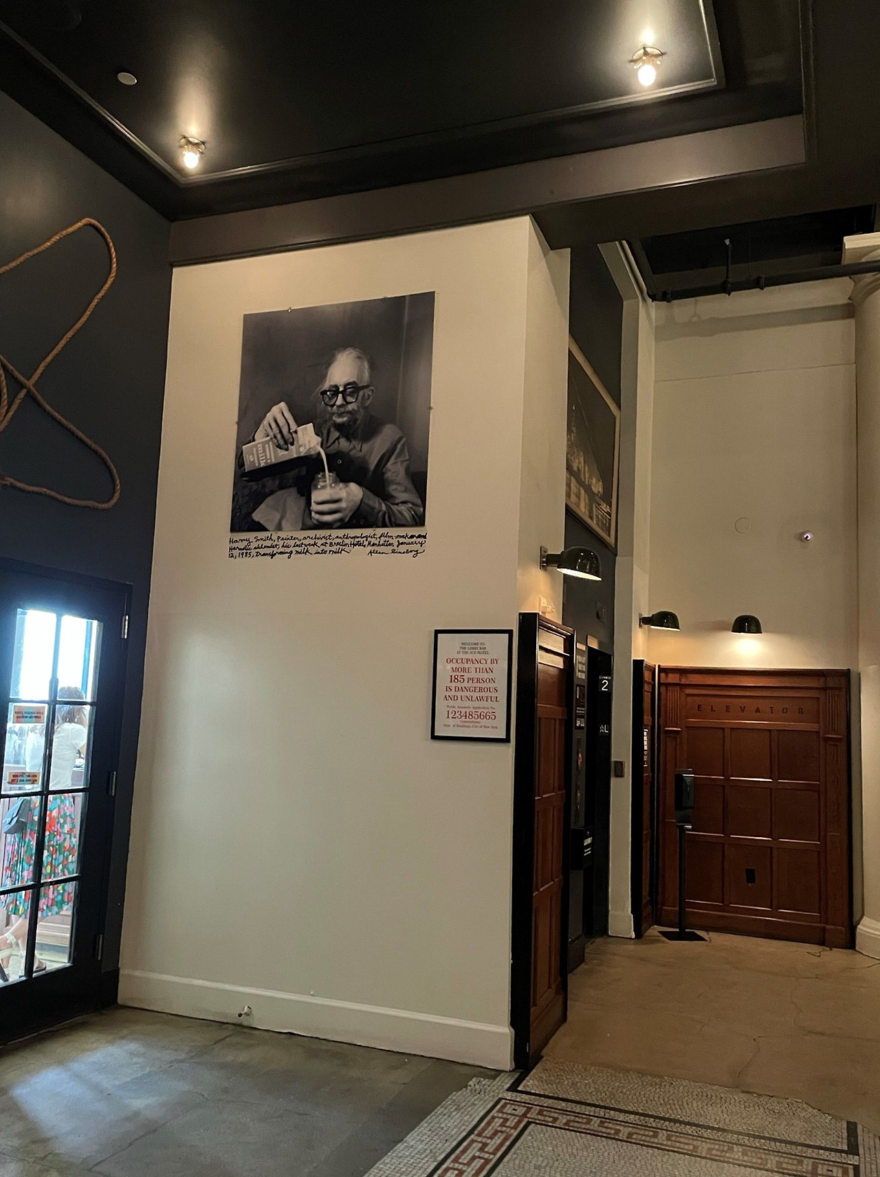 프런트 데스크의 맞은편 벽에는 재미있는 작품이 한 점 걸려있다(그림 3). 에이스 호텔의 전신인 브레슬린 호텔에 1985년까지 거주했던 괴짜 예술가, 해리 스미스(Harry Smith)의 사진이다(Allen Ginsberg 作). 브레슬린 호텔의 역사를 이어 스토리를 만드는 방식이 참신하다.