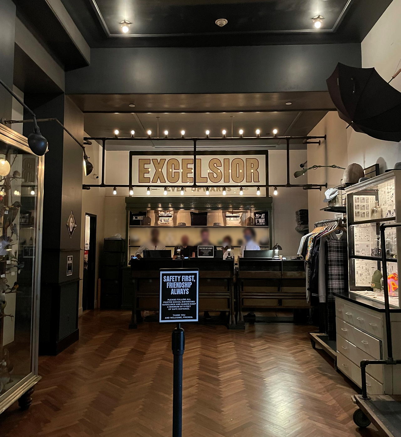 호텔의 로비에서 가장 밝은 곳은 흰색 벽, 따뜻한 색조명과 호텔에서 판매하는 소품으로 꾸며진 프런트 데스크다. 5성급 호텔의 프런트 데스크 뒷벽은 예술품이 걸려 있지만, 이곳은 호텔에서 판매하는 에이스만의 소품들로 꾸며져 있다. 별도의 호텔 기프트 숍 없이 프런트 데스크 뒷벽과 복도의 측면을 활용해 에이스의 쿠션, 머그컵, 우산, 바디 용품, 의류 등을 디스플레이한다(그림 1). 또한 프런트 데스크 뒷면 벽 상단에 적힌 ‘EXCELSIOR, EVER UPWARDS’가 시선을 사로잡는다. Excelsior는 라틴어로 ‘끝없이 비상하는’이란 의미를 담은 단어로 뉴욕주의 모토이기도 하다. 이는 뉴욕의 에이스 호텔에서만 볼 수 있는 광경이다.