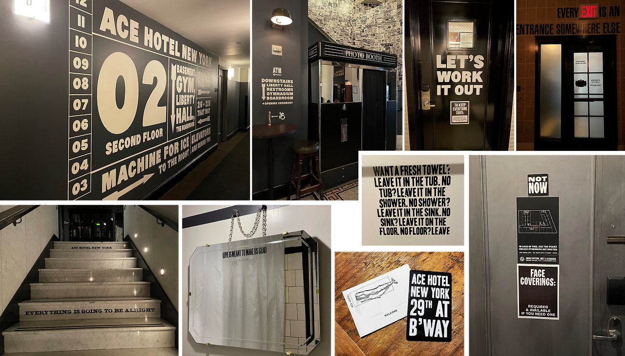 특급 호텔에서 흔히 볼 수 있는 값비싼 예술품 대신, 이곳은 소품 및 그래픽 디자인을 활용해 에이스만의 분위기를 연출한다. 로비 바의 카운터 뒤편엔 대형 성조기를, 지하로 통하는 복도 입구 상단에는 대형 A자 오브제를, 사이니지 대신 벽면에 페인트로 글씨를 쓴 형태의 그래픽 디자인을 활용했다. 이러한 사이니지는 멀리서 쉽게 보이지는 않지만, 장소 명의 길이에 따라 글씨 크기 및 자간을 조절한 그래픽 디자인으로 공간의 재미 요소로 작용한다(그림 5). 로비 화장실은 남녀 공용의 1인용으로 ‘All Person Restroom’과 함께 누구에게나 열려 있다는 포용의 메시지가 적혀 있다. 빈티지한 목재 문의 엘리베이터를 타고 객실 층에 내리면 벽면에 거대한 그래픽 사이니지가 그려져 있다. 이러한 그래픽 디자인은 객실 카드 키와 객실 안의 설명서, 소품, 벽면 메시지에도 일관성 있게 나타난다.