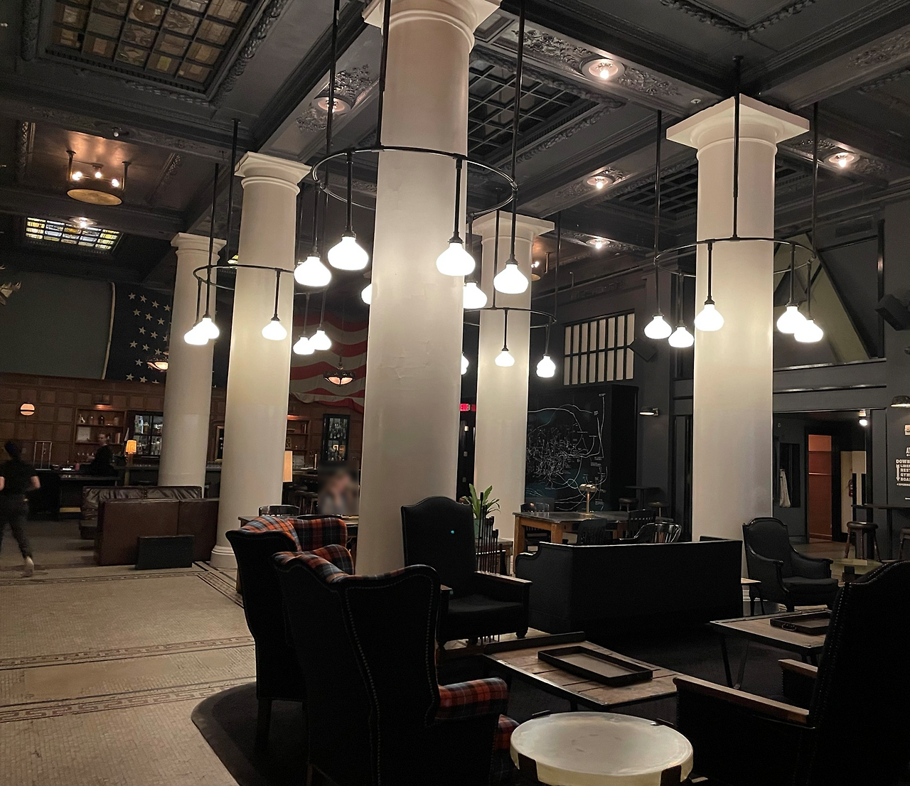 지난 4월호에서도 잠깐 다뤘듯이 에이스 호텔의 브랜드 철학은 다양한 사람들과 커뮤니티를 형성하고 각 도시의 역사와 문화를 아우르는 공간을 만드는 것이다. 뉴욕의 에이스 호텔 역시 뉴욕의 다양성을 담은 힙하고 키치(Kitsch)한 매력을 곳곳에 표현하고자 노력했다. 호텔 전반에 사용된 컬러는 검정과 회색, 흰색의 무채색이고, 레트로 스타일의 조명과 빈티지한 스타일의 가구들이 조화를 이뤄, 에이스만의 힙한 빈티지 스타일을 완성한다. 어두운 색상과 낮은 조도로 인해 호텔은 전반적으로 어둡다.