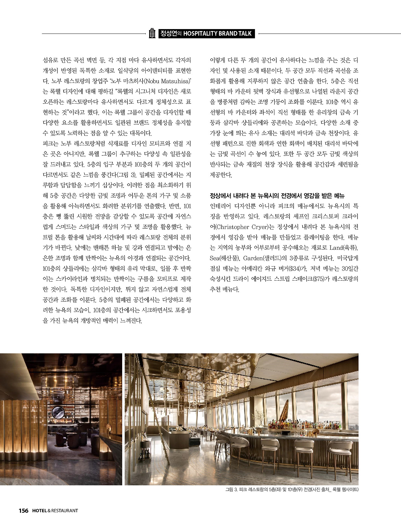 피크는 노부 레스토랑처럼 식재료를 디자인 모티프와 연결 지은 곳은 아니지만, 록웰 그룹이 추구하는 다양성 속 일관성을 잘 드러내고 있다. 5층의 입구 부분과 101층의 두 개의 공간이 다르면서도 같은 느낌을 풍긴다(그림 3). 밀폐된 공간에서는 지루함과 답답함을 느끼기 십상이다. 이러한 점을 최소화하기 위해 5층 공간은 다양한 금빛 조명과 어두운 톤의 가구 및 소품을 활용해 아늑하면서도 화려한 분위기를 연출했다. 반면, 101층은 뻥 뚫린 시원한 전망을 감상할 수 있도록 공간에 자연스럽게 스며드는 스타일과 색상의 가구 및 조명을 활용했다. 뉴트럴 톤을 활용해 날씨와 시간대에 따라 레스토랑 전체의 분위기가 바뀐다. 낮에는 맨해튼 하늘 및 강과 연결되고 밤에는 은은한 조명과 함께 반짝이는 뉴욕의 야경과 연결되는 공간이다.