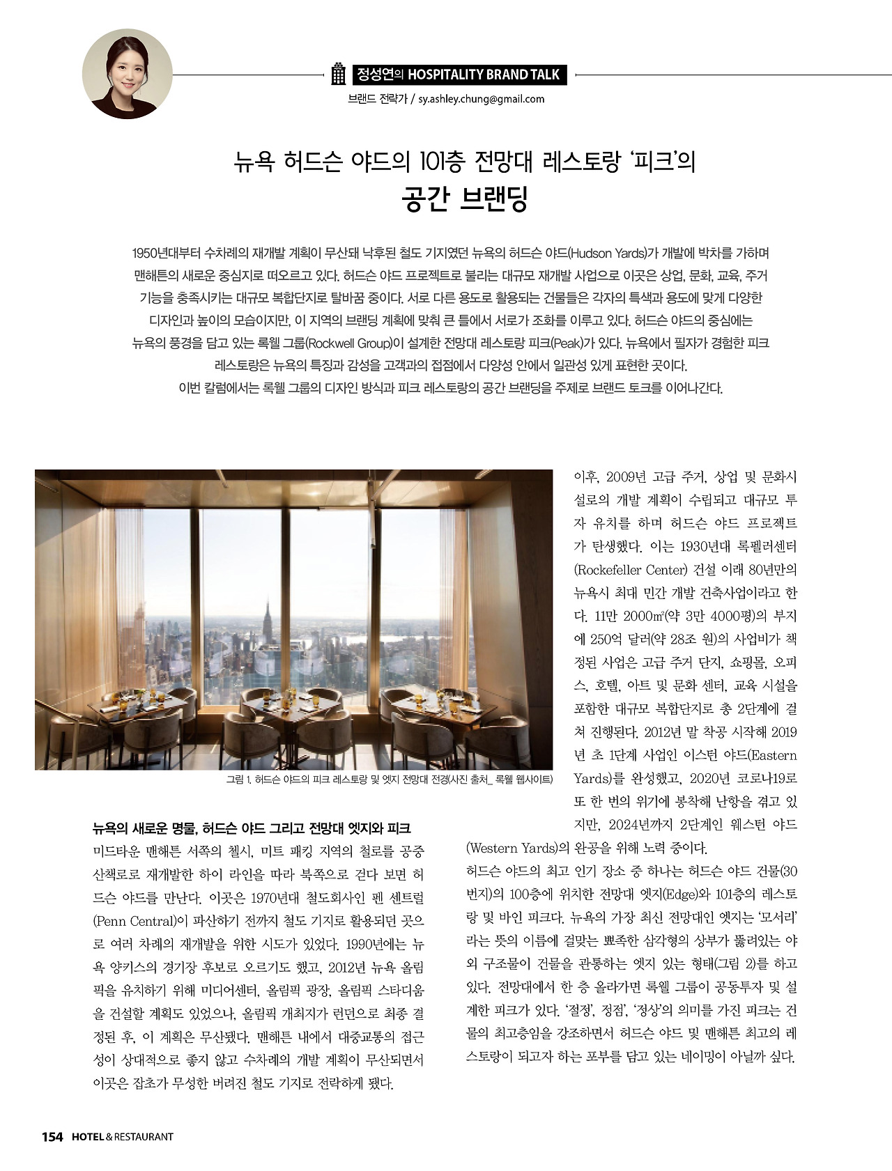 1950년대부터 수차례의 재개발 계획이 무산돼 낙후된 철도 기지였던 뉴욕의 허드슨 야드(Hudson Yards)가 개발에 박차를 가하며 맨해튼의 새로운 중심지로 떠오르고 있다. 허드슨 야드 프로젝트로 불리는 대규모 재개발 사업으로 이곳은 상업, 문화, 교육, 주거 기능을 충족시키는 대규모 복합단지로 탈바꿈 중이다. 서로 다른 용도로 활용되는 건물들은 각자의 특색과 용도에 맞게 다양한 디자인과 높이의 모습이지만, 이 지역의 브랜딩 계획에 맞춰 큰 틀에서 서로가 조화를 이루고 있다. 허드슨 야드의 중심에는 뉴욕의 풍경을 담고 있는 록웰 그룹(Rockwell Group)이 설계한 전망대 레스토랑 피크(Peak)가 있다. 뉴욕에서 필자가 경험한 피크 레스토랑은 뉴욕의 특징과 감성을 고객과의 접점에서 다양성 안에서 일관성 있게 표현한 곳이다. 이번 칼럼에서는 록웰 그룹의 디자인 방식과 피크 레스토랑의 공간 브랜딩을 주제로 브랜드 토크를 이어나간다.