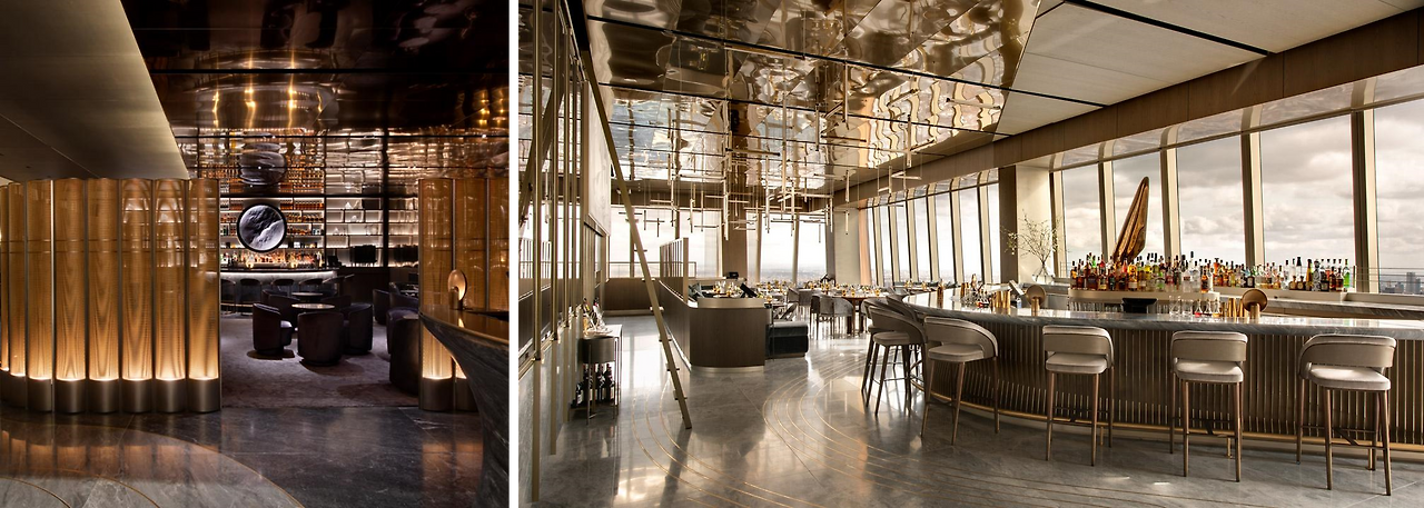 이렇게 다른 두 개의 공간이 유사하다는 느낌을 주는 것은 디자인 및 사용된 소재 때문이다. 두 공간 모두 직선과 곡선을 조화롭게 활용해 지루하지 않은 공간 연출을 한다. 5층은 직선 형태의 바 카운터 뒷벽 장식과 유선형으로 나열된 라운지 공간을 병풍처럼 감싸는 조명 기둥이 조화를 이룬다. 101층 역시 유선형의 바 카운터와 좌석이 직선 형태를 한 유리창의 금속 기둥과 삼각바 샹들리에와 공존하는 모습이다. 다양한 소재 중 가장 눈에 띄는 유사 소재는 대리석 바닥과 금속 천장이다. 유선형 패턴으로 진한 회색과 연한 회색이 배치된 대리석 바닥에는 금빛 곡선이 수 놓여 있다. 또한 두 공간 모두 금빛 색상의 반사되는 금속 재질의 천장 장식을 활용해 공간감과 세련됨을 제공한다.