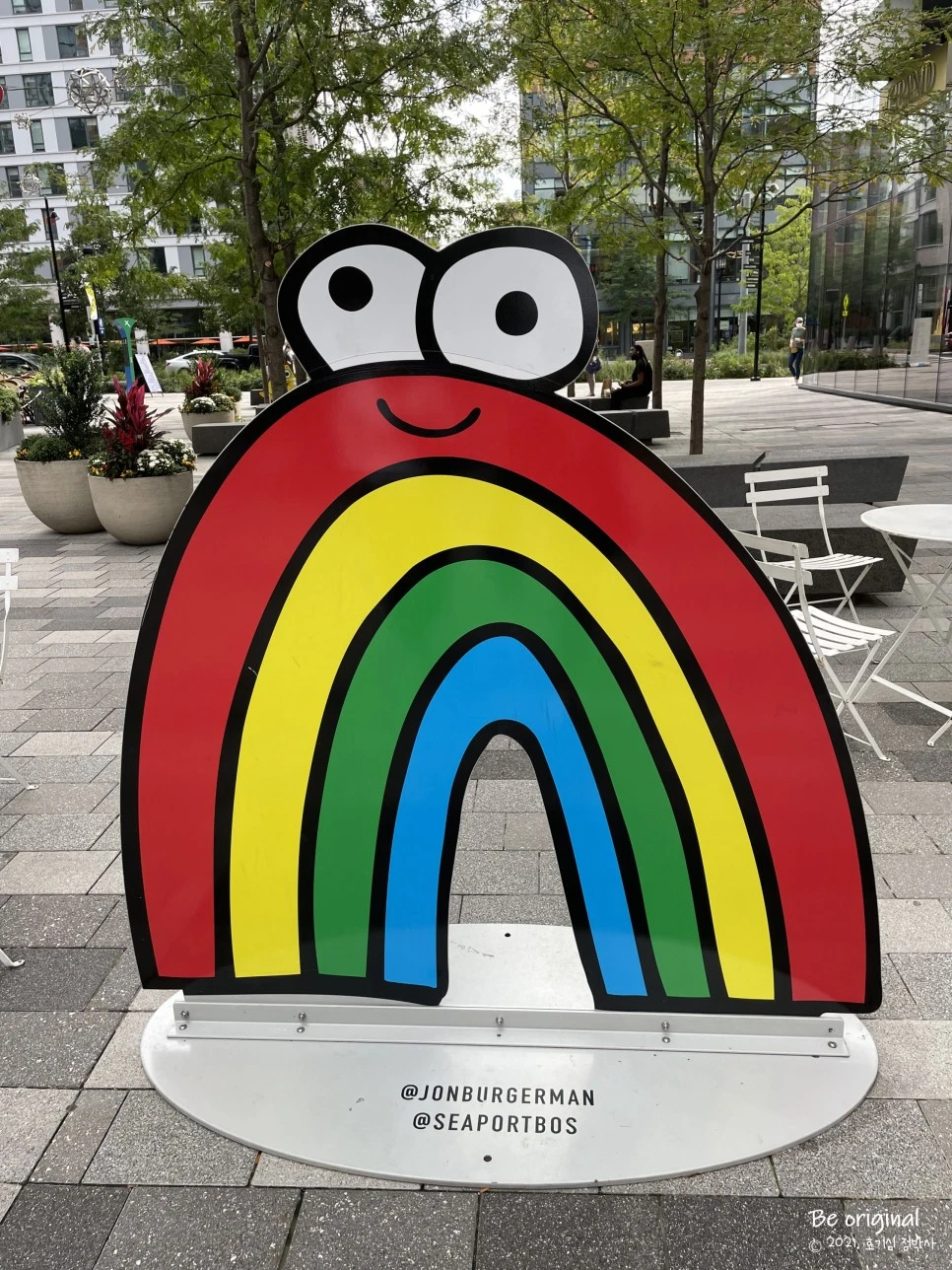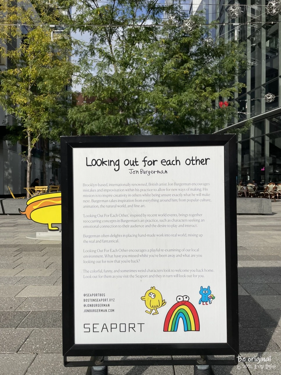 존 버거맨의 이번 작품은 Looking out for each other. 작가가 자신의 인스타그램에 올렸던 작품들을 바탕으로 2D 및 3D 설치물로 제작한 것이다. 버거맨은 보스턴 시민들이 이 캐릭터들과 소통하면 좋겠다는 바람으로 만들었다고 한다. 이 작품들은 차가운 콘크리트 거리와 메탈, 유리 빌딩 사이의 One Seaport 광장에 설치됐다. 귀여운 친구들로 삭막함이 없어졌고, 팬데믹으로 얼어붙은 보스턴 사람들의 마음을 녹여준다.