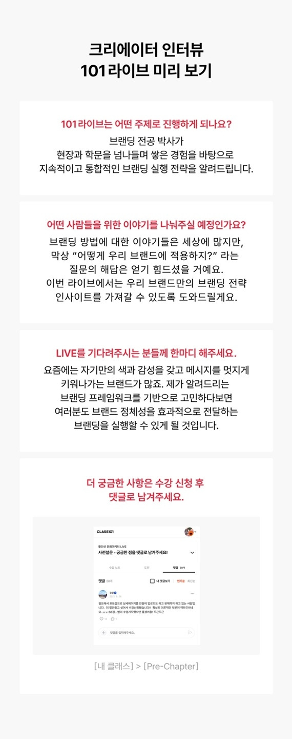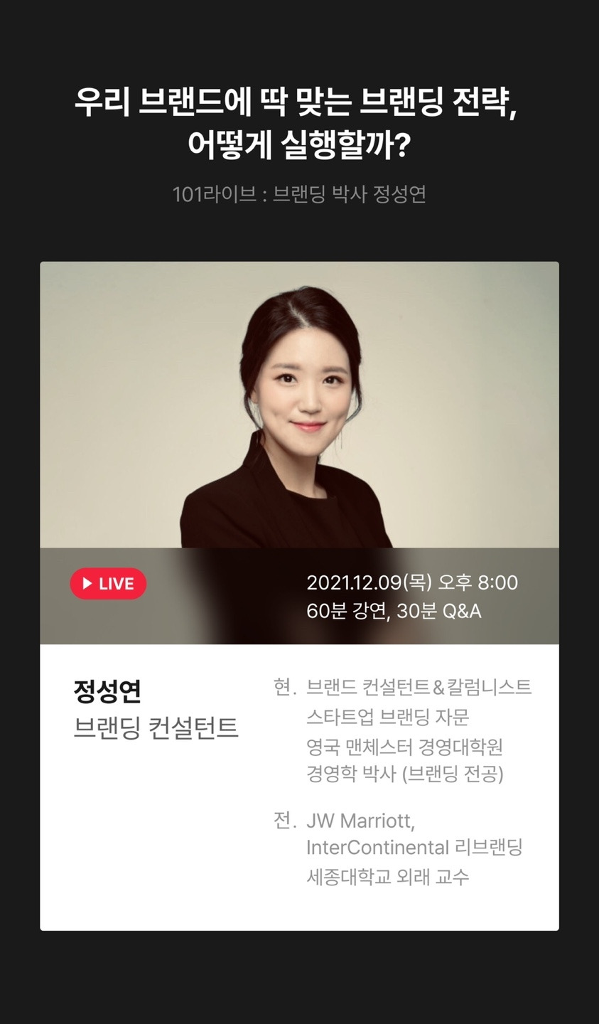 '101 라이브'는 전문가의 인사이트를 생생하게 전달하고자 하는 취지로 클래스 101에서 11월 말부터 새롭게 시작한 프로그램이라고 해요. 저는 그중 2번째 강의를 맡게 되었고요, 이번 주 목요일 (12/9) 20:00-21:30에 90분 동안 '바로 실행할 수 있는 브랜딩 전략'을 줌(ZOOM)을 통해 전합니다. 브런치에는 강의와 관련한 글을 쓰기가 애매해서 망설이고 있었는데, 제 브런치를 구독해주시는 분들께서도 브랜딩에 관심이 많으실 거라는 생각에 공유하기로 했어요. 생각지도 못하게 클래스 101을 통해 미국 보스턴에 거주하는 제가 브랜딩을 고민하고 있는 분들과 온라인 라이브로 만나게 되어 참 감사하고 설레네요.