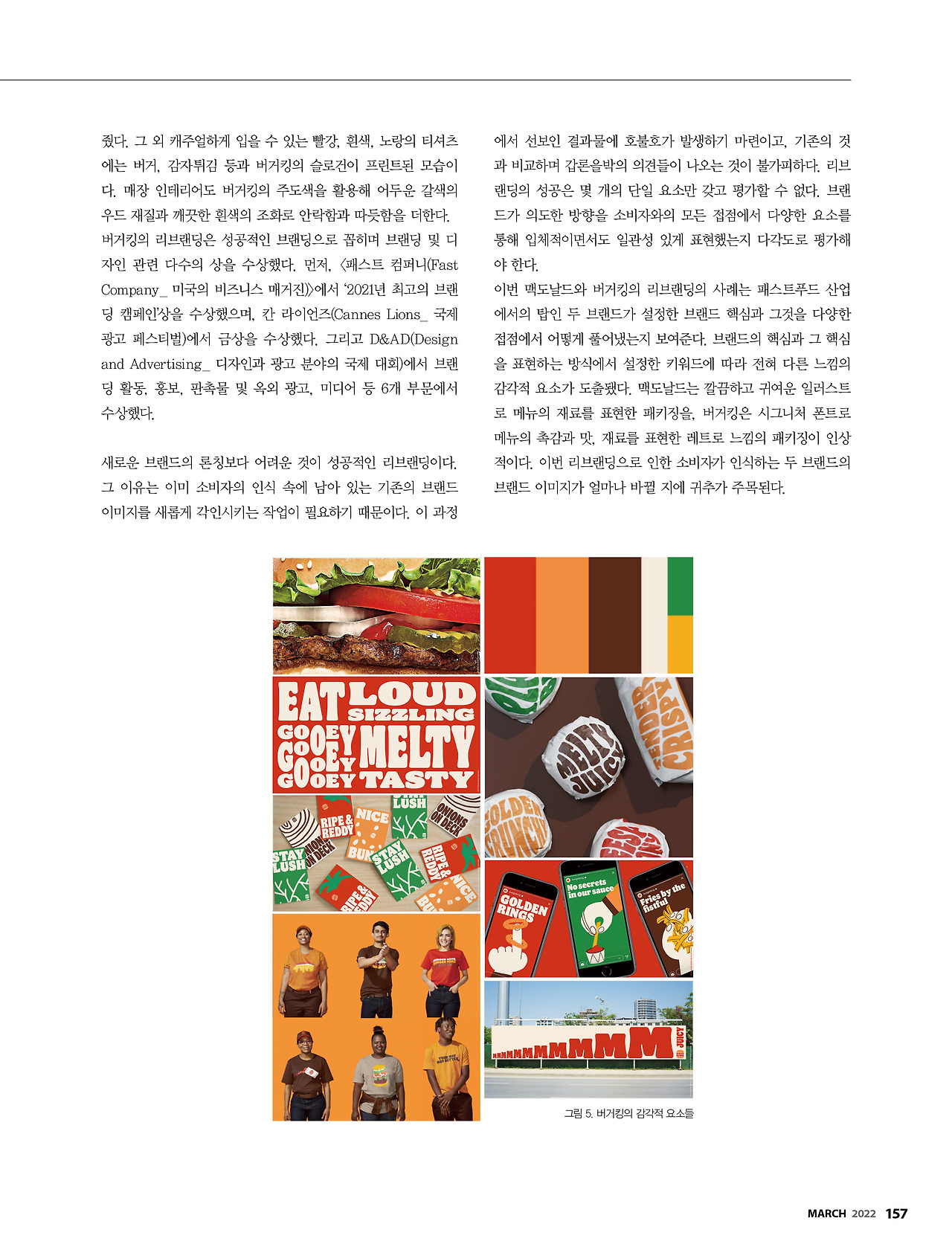 이번 맥도날드와 버거킹의 리브랜딩의 사례는 패스트푸드 산업에서의 탑인 두 브랜드가 설정한 브랜드 핵심과 그것을 다양한 접점에서 어떻게 풀어냈는지 보여준다. 브랜드의 핵심과 그 핵심을 표현하는 방식에서 설정한 키워드에 따라 전혀 다른 느낌의 감각적 요소가 도출됐다. 맥도날드는 깔끔하고 귀여운 일러 스트로 메뉴의 재료를 표현한 패키징을, 버거킹은 시그니처 폰트로 메뉴의 촉감과 맛, 재료를 표현한 레트로 느낌의 패키징이 인상적이다. 이번 리브랜딩으로 인한 소비자가 인식하는 두 브랜드의 브랜드 이미지가 얼마나 바뀔 지에 귀추가 주목된다.