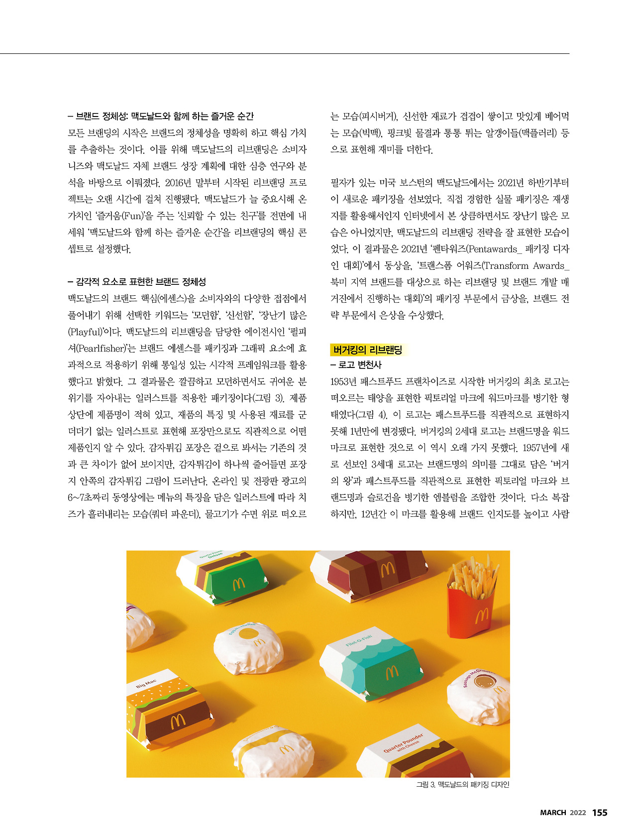 필자가 있는 미국 보스턴의 맥도날드에서는 2021년 하반기부터 이 새로운 패키징을 선보였다. 직접 경험한 실물 패키징은 재생지를 활용해서인지 인터넷에서 본 상큼하면서도 장난기 많은 모습은 아니었지만, 맥도날드의 리브랜딩 전략을 잘 표현한 모습이었다. 이 결과물은 2021년 ‘펜타워즈(Pentawards_ 패키징 디자인 대회)’에서 동상을, ‘트랜스폼 어워즈(Transform Awards_북미 지역 브랜드를 대상으로 하는 리브랜딩 및 브랜드 개발 매거진에서 진행하는 대회)’의 패키징 부문에서 금상을, 브랜드 전략 부문에서 은상을 수상했다.