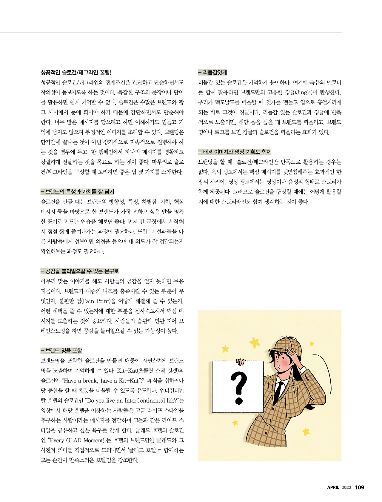 리듬감 있는 슬로건은 기억하기 용이하다. 여기에 특유의 멜로디를 함께 활용하면 브랜드만의 고유한 징글(Jingle)이 탄생한다. 우리가 맥도날드를 떠올릴 때 귓가를 맴돌고 입으로 흥얼거리게 되는 바로 그것이 징글이다. 리듬감 있는 슬로건과 징글에 반복적으로 노출되면, 해당 음을 들을 때 브랜드를 떠올리고, 브랜드명이나 로고를 보면 징글과 슬로건을 떠올리는 효과가 있다.