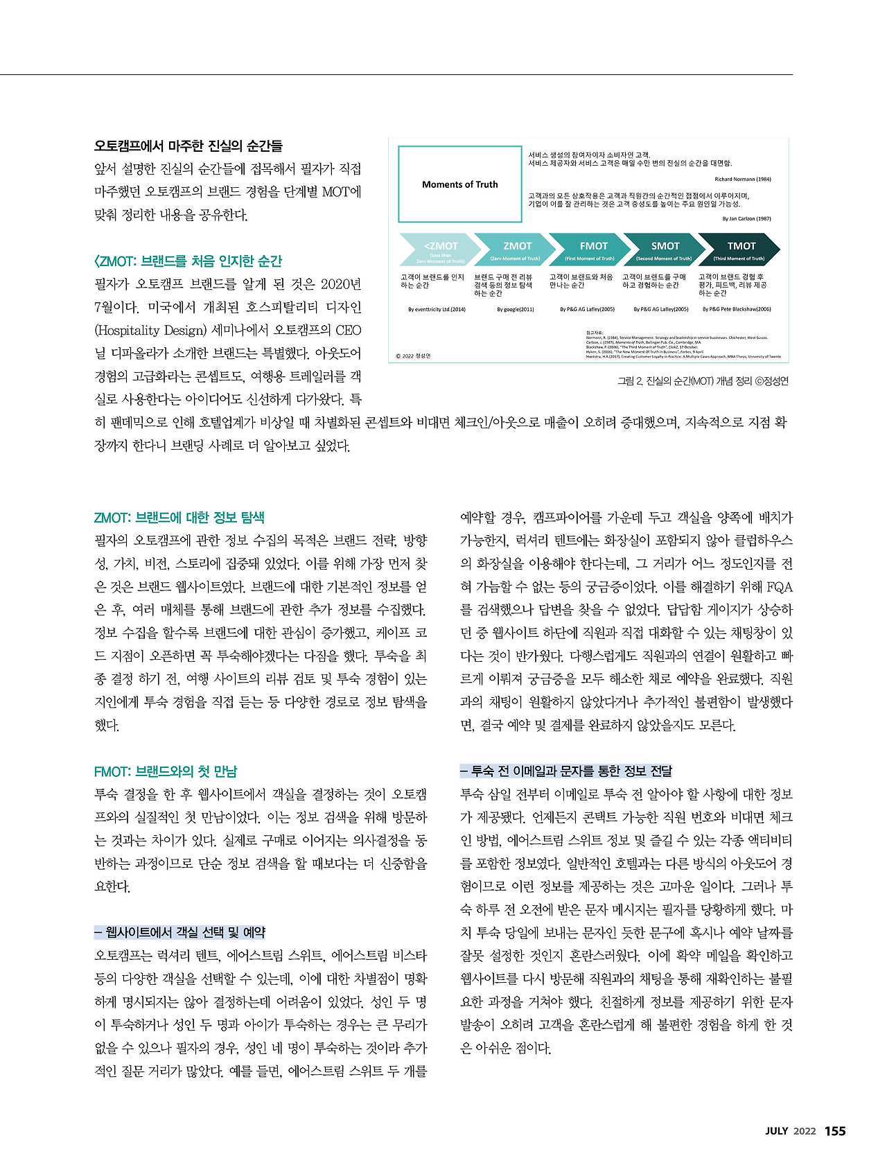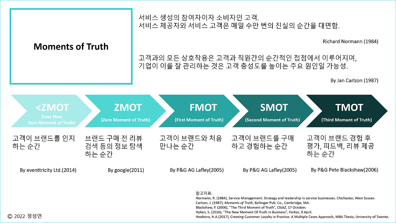 MOT의 개념은 1980년대부터 2010년대까지 학자와 기업인들 에 의해 발전을 거듭했다(그림 2). 1984년 스웨덴의 마케팅 학자 인 리차드 노먼(Richard Normann)에 의해 서비스 경영 문헌에 서 MOT의 개념이 최초로 등장한다. 스칸디나비아 항공(SAS)의 얀 칼슨(Jan Carlzon) 사장은 1987년 출간한 그의 책에서 “기업이 고객과의 모든 상호작용(MOT)을 관리하면 성공적인 비즈니스를 할 수 있다.”는 강력한 메시지를 전했다. P&G의 CEO 라플리는(AG Lafley)는 2005년에 진실의 순간을 2단계로 구분했다. 고객이 오프라 인이든 온라인이든 브랜드를 처음 접하는 순간인 FMOT(First Moment of Truth)과 고객이 실제로 브랜드를 구매하고 브 랜드의 약속을 경험하는 순간인 SMOT(Second Moment of Truth)다.