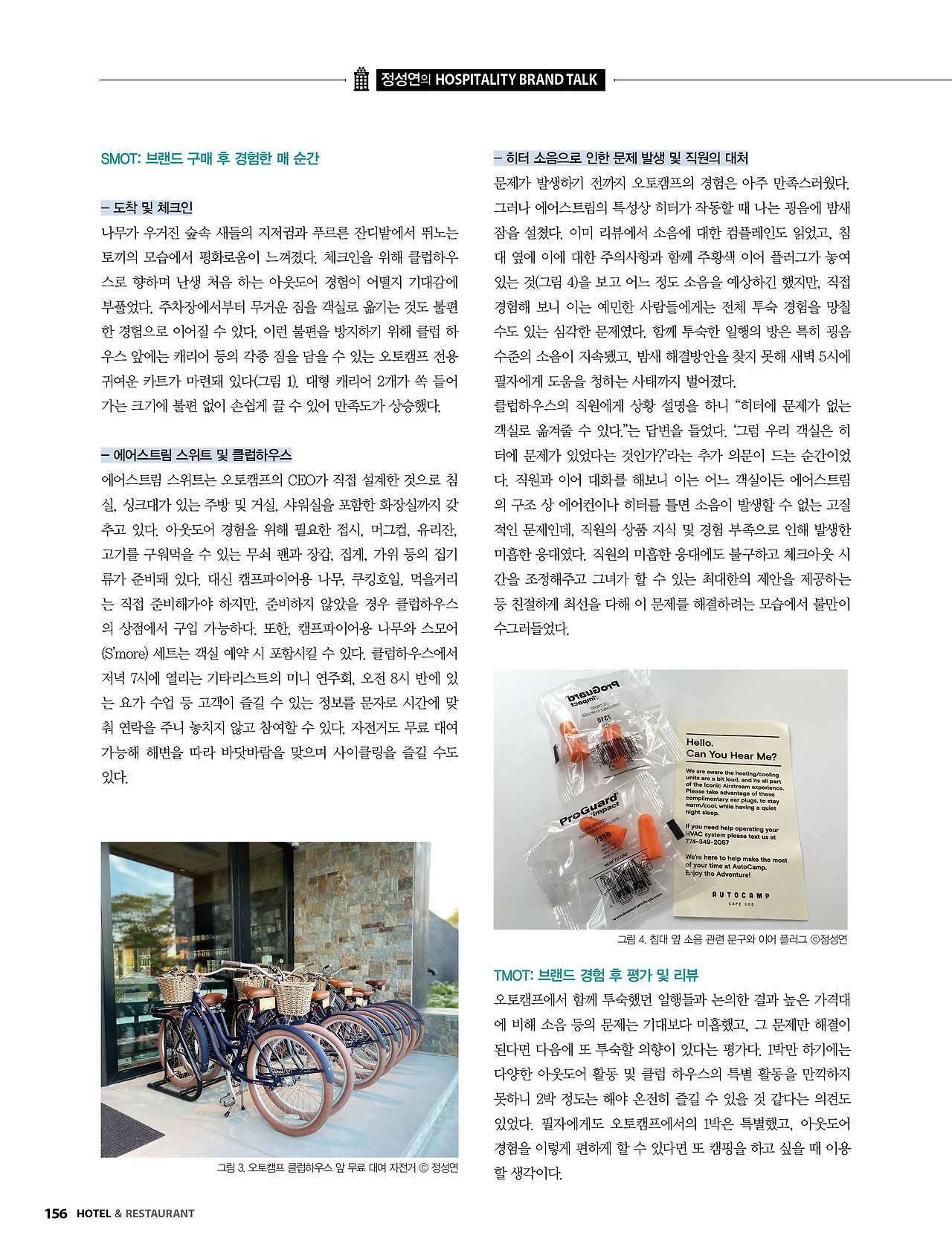 필자는 지난 칼럼에서 오토캠프(AutoCamp)의 브랜딩 전략에 대해 다뤘다(정성연, 「아웃도어 부티크 호텔, ‘오토캠프(AutoCamp)’_ <호텔 앤 레스토랑> 2020년 11월 호). 오토캠프는 여행용 트레일러 에어스트림(AirStream)을 객실로 활용해 편안하고 고급화된 아웃도어 경험을 즐길 수 있는 신개념 호텔이다. 올 5월에는 오토캠프의 브랜드 전략이 잘 실행되고 있는지 확인하기 위해 케이프 코드 지점을 방문했다. 이번 브랜드 토크는 오토캠프에서 마주한 진실의 순간들과 브랜드 경험 디자인의 중요성에 대해 살펴본다.
