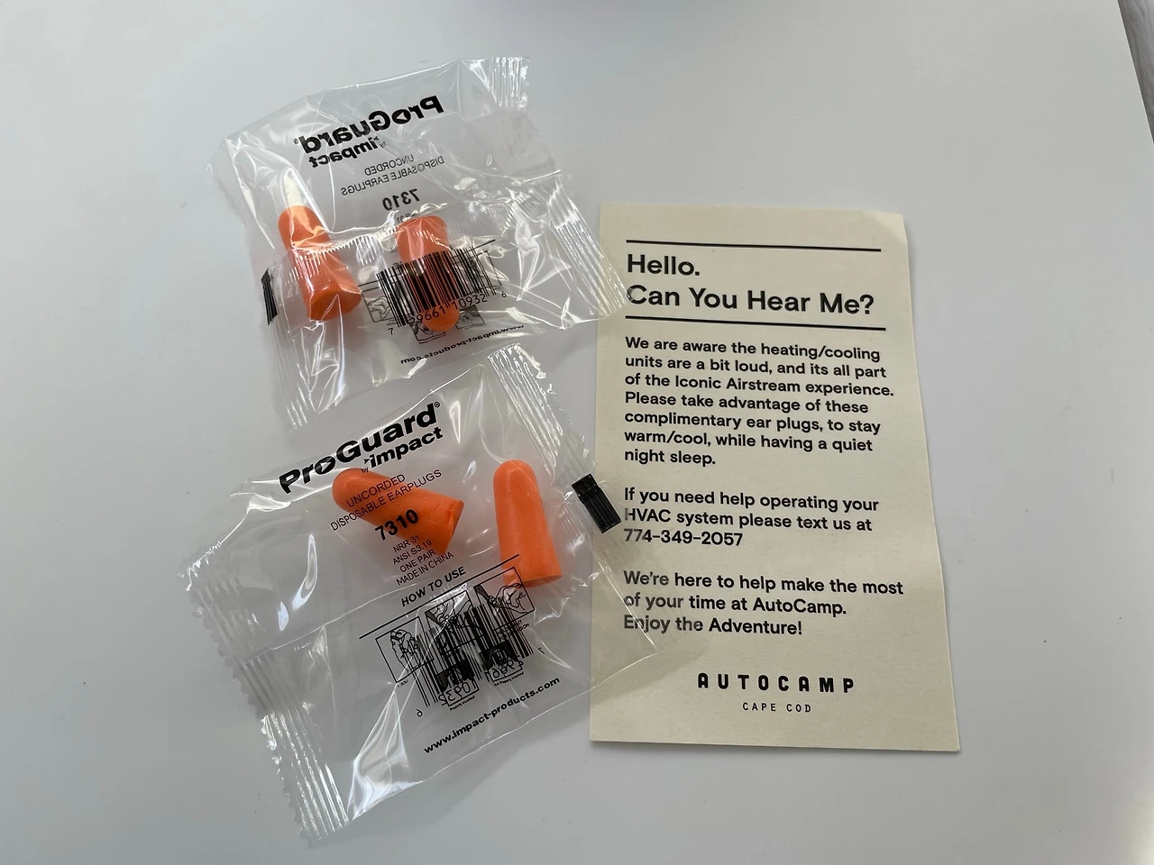 문제가 발생하기 전까지 오토캠프의 경험은 아주 만족스러웠다. 그러나 에어스트림의 특성상 히터가 작동할 때 나는 굉음에 밤새 잠을 설쳤다. 이미 리뷰에서 소음에 대한 컴플레인도 읽었고, 침대 옆에 이에 대한 주의사항과 함께 주황색 이어 플러그가 놓여있는 것(그림 4)을 보고 어느 정도 소음을 예상하긴 했지만, 직접 경험해 보니 이는 예민한 사람들에게는 전체 투숙 경험을 망칠 수도 있는 심각한 문제였다. 함께 투숙한 일행의 방은 특히 굉음 수준의 소음이 지속됐고, 밤새 해결방안을 찾지 못해 새벽 5시에 필자에게 도움을 청하는 사태까지 벌어졌다.