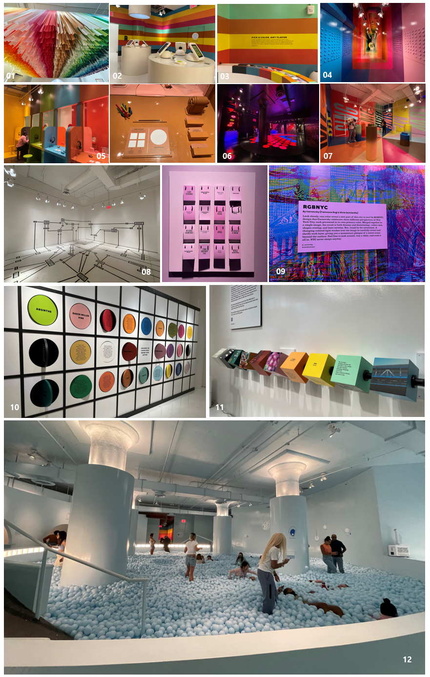컬러 팩토리는 색을 활용한 다양한 활동을 할 수 있는 공간이므로 주로 시각적인 자극을 주는 곳이다. 그러나 그 외에도 미각, 후각, 청각, 촉각 등 오감을 만족시킬 수 있도록 설계됐다. 입구에서부터 아이스크림을 나눠주는데, 이는 여정의 시작을 긍정적인 기분으로부터 시작할 수 있도록 하는 전략이다. 이 외에도 공간마다 색깔 별 마카롱, 젤리, 팝콘, 아이스크림 등 미각을 만족시키는 달콤한 간식이 제공된다. 그림 3은 필자가직접 촬영한 뉴욕 컬러 팩토리의 대표 공간과 작품을 담은 사진 모음이다.