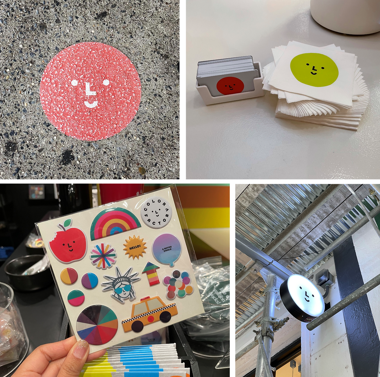 컬러 팩토리의 로고는 워드 마크와 픽토리얼 마크를 조합한 형태다(그림 1의 중앙 마크). 브랜드명을 원형으로 표기한 워드마크에 글자 C, L, O를 활용해 웃는 얼굴 형태를 표현한 픽토리얼 마크를 완성했다. 웃는 얼굴 형태는 브랜드의 심벌로 곳곳에 활용되고 있다(그림 2). 컬러 팩토리가 전하고자 하는 브랜드의 핵심 메시지는 색을 통한 영감, 행복, 연결이다. 도시를 대표하는 색상에 스토리를 담고, 색을 주제로 한 지역 예술가들의 작품을 전시하며, 방문객들은 그 안에서 작품과 다른 방문객들과 상호 교류하면서 잊지 못할 경험과 추억을 쌓는다.