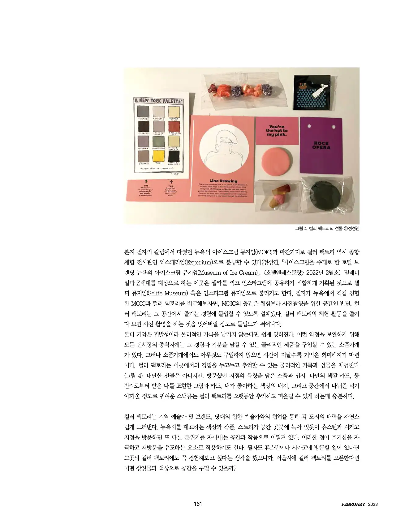 본디 기억은 휘발성이라 물리적인 기록을 남기지 않는다면 쉽게 잊힌다. 이런 약점을 보완하기 위해 모든 전시장의 종착지에는 그 경험과 기분을 남길 수 있는 물리적인 제품을 구입할 수 있는 소품가게가 있다. 그러나 소품가게에서도 아무것도 구입하지 않으면 시간이 지날수록 기억은 희미해지기 마련이다. 컬러 팩토리는이곳에서의 경험을 두고두고 추억할 수 있는 물리적인기록과 선물을 제공한다(그림 4). 대단한 선물은 아니지만, 방문했던 지점의 특징을 담은 소품과 엽서, 나만의 색깔 카드, 동반자로부터 받은 나를 표현한 그림과 카드, 내가 좋아하는 색상의 배지, 그리고 공간에서 나눠준 먹기아까울 정도로 귀여운 스낵류는 컬러 팩토리를 오랫동안 추억하고 떠올릴 수 있게 하는데 충분하다.