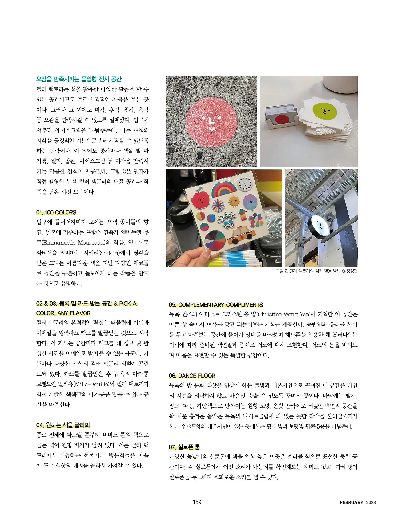 본지 필자의 칼럼에서 다뤘던 뉴욕의 아이스크림 뮤지엄(MOIC)과 마찬가지로 컬러 팩토리 역시 종합체험 전시관인 익스페리엄(Experium)으로 분류할 수 있다(정성연, 「아이스크림을 주제로 한 토털 브랜딩 뉴욕의 아이스크림 뮤지엄(Museum of Ice Cream)」, <호텔앤레스토랑> 2022년 2월호). 밀레니얼과 Z세대를 대상으로 하는 이곳은 셀카를 찍고 인스타그램에 공유하기 적합하게 기획된 것으로 셀피 뮤지엄(Selfie Museum) 혹은 인스타그램 뮤지엄으로 불리기도 한다. 필자가 뉴욕에서 직접 경험한 MOIC과 컬러 팩토리를 비교해 보자면, MOIC의 공간은 체험보다 사진촬영을 위한 공간인 반면, 컬러 팩토리는 그 공간에서 즐기는 경험에 몰입할 수 있도록 설계됐다. 컬러 팩토리의 체험 활동을 즐기다 보면 사진 촬영을 하는 것을 잊어버릴 정도로 몰입도가 뛰어나다.