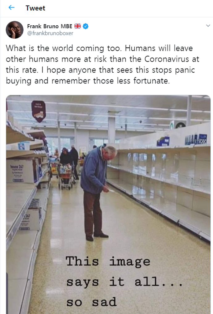 영국의 복싱 코치 프랭크 부르노가 어제 자신의 트위터에 사람이 사람을 더 위태롭게 한다며 사재기를 멈춰달라는 메시지와 함께 게시한 사진이 마음을 울립니다.