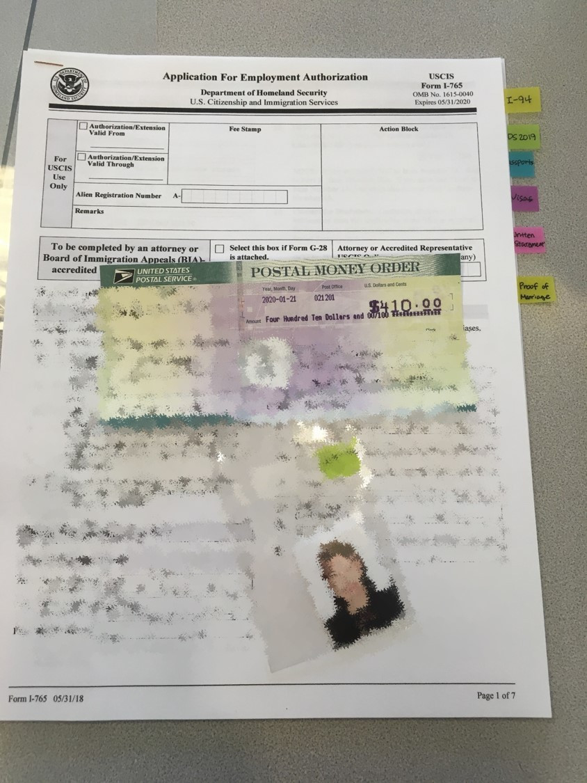 1. J2비자 소지자가 검은색 펜으로 직접 작성한 I-765 서류 (양식은 인터넷에서 다운로드할 수 있다)