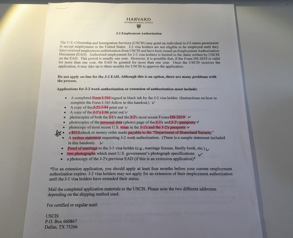 1월 초에 미국 도착하자마자 HIO (Harvard International Office, 하버드 국제 오피스)에 신고하러 짝꿍과 방문하니 매뉴얼에 나와 있는 듯, J2비자 소지자를 위한 EAD 신청 설명서 패킷을 줍니다. 온라인으로 신청하면 오류가 많으니 반드시 서류를 출력하여 신청하라는 팁과 함께. 이 패킷은 EAD 신청 시 필요한 서류를 맨 앞 장에 일목요연하게 정리해놓고, 일반우편/certified mail 인지 특급우편/courier service인지에 따라 받는 주소가 달라지는 것에 대한 정보, 자칫 복잡하고 헷갈릴 수 있는 I-765 서류를 작성하는 방법까지 정말 상세하게 설명하고 있어요. 타국에서 서류 작업 오류로 일이 꼬이면 해결하기도 쉽지 않고 좋지 않은 경험으로 자리 잡을 가능성이 많아지는데, 역시 세계 최고의 대학답게 이런 서비스도 참 체계적으로 잘 운영하고 있다는 생각이 드는 순간.