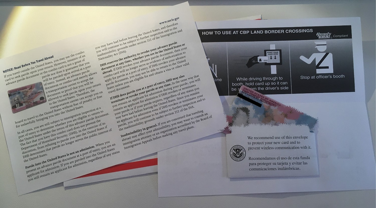 EAD 서류를 발송할 때 보낸 사진이 EAD카드에 그대로 사용되었어요. 다른 ID카드는 즉석에서 사진촬영을 해 세상 못난이로 나와 한국의 보정술이 그리웠다죠..? 이 카드에는 유효기간이 있습니다. DS-2019에 명시된 스폰서십과 동일한 유효기간으로 스폰서십이 종료되면 더 이상 사용할 수 없어요. 대부분의 EAD카드는 "NOT VALID FOR REENTRY TO U.S"문구가 입력되어 있는데, 콤보 카드의 경우는 "SERVES AS I-512 ADVANCE PAROLE"이라 적혀 있다고 해요. 이는 일시적인 관광 허가증과 유사한 것. 설명서는 콤보 카드를 받은 사람들을 위한 것이고, 대다수의 사람들은 취업을 할 때 회사에 보여주는 용도로만 사용 가능하답니다. 무선 통신을 방지하면서 카드를 보호할 수 있는 귀여운 봉투까지 :)