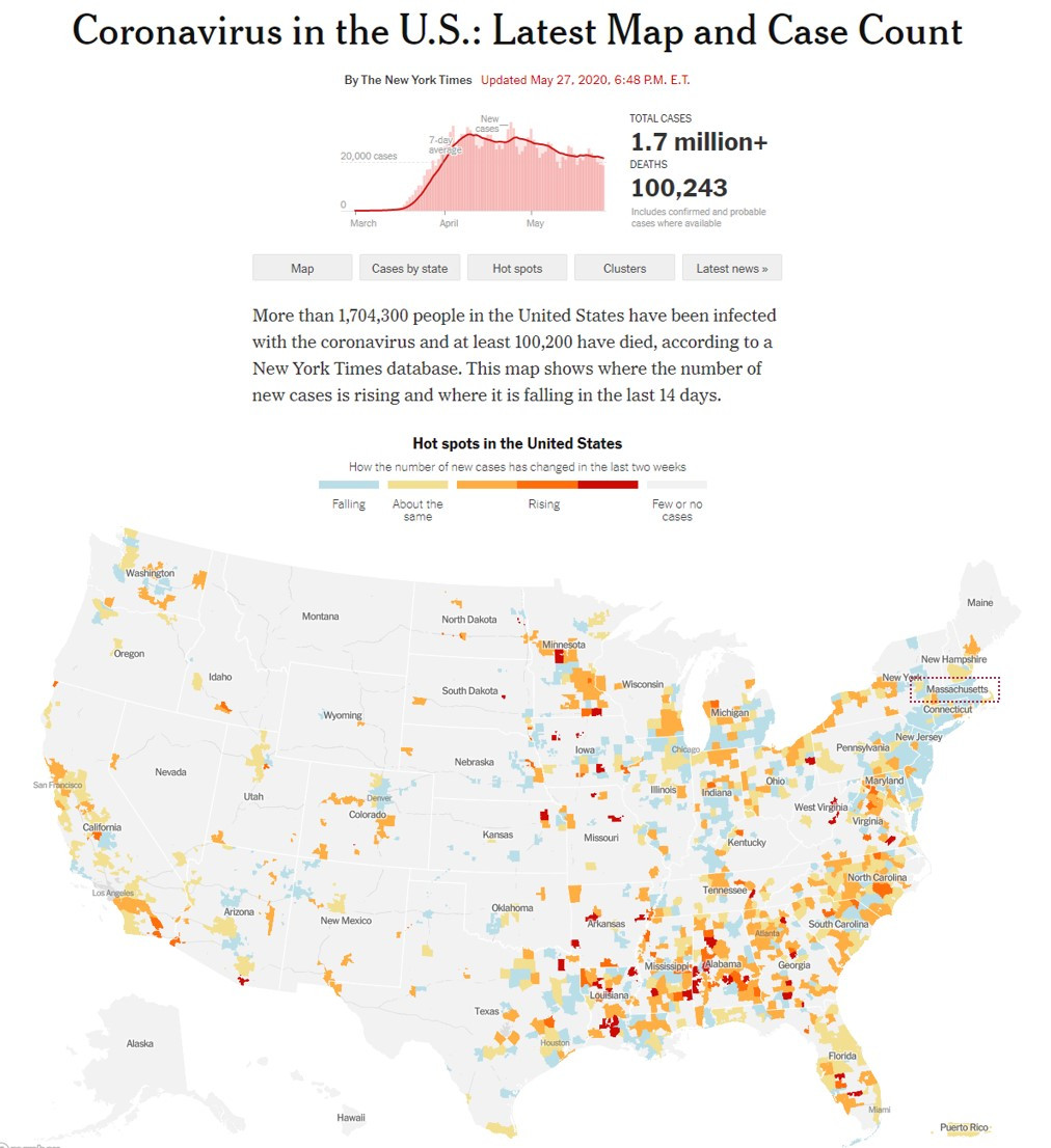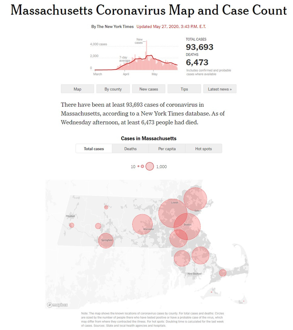 전체 감염자수로 보면 뉴욕과 뉴저지, 매사추세츠 지역인 동부 지역이 절대적으로 많은데, 3월부터 5월까지 급 증가세를 보이다가 이제는 한 풀 꺾여 확진자수가 줄어들고 있다고 표시가 되네요. 그대신 중남부쪽이 감염자가 늘고 있는 모습을 보이고 있어요. 미국은 땅덩이가 워낙 넓다보니 한 번에 잡기가 불가능해 보입니다. 보스턴이 있는 매사추세츠주는 미국내에서 감염자수로 3~5위를 오르락내리락 하고 있는 지역이에요. 5월 27일 현재 기준 확진자 93,000명 (총 인구 635만명 중), 사망자는 6,500명에 가까운 숫자를 기록하고 있습니다. 보스턴이 속해있는 서폭크 카운티의 경우, 인구 80만명 중에 17,000명 이상의 확진자와 800명 이상이 사망했다고 하니 참 엄청난 숫자죠.