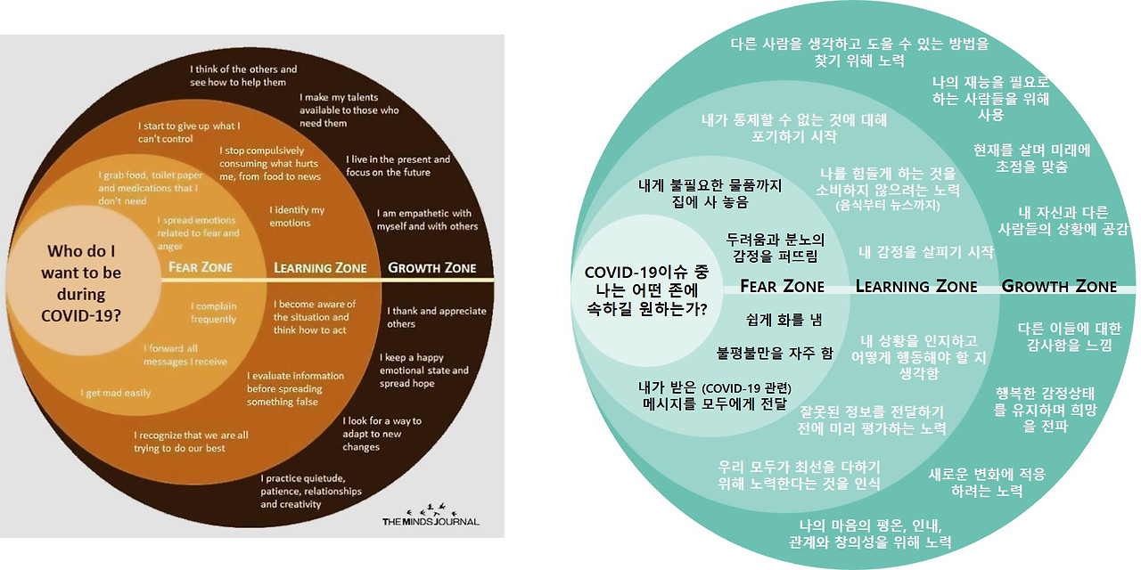 이 다이아그램은 두려움존 (Fear zone), 배움존 (Learning zone), 성장존 (Growth zone)의 3가지 존으로 구분을 하고 단계별 행동을 나열하고 있습니다. 두려움존은 우리가 코로나 사태 초반에 경험해 본 행동들이라 생각되는데요, 앞으로 어떤 상황이 벌어질지 모른다는 두려움으로 인해 보이는 행동들이 속해 있습니다. 이를 테면 내게 불필요한 물품까지 사놓는 사재기 현상, 코로나 관련 전송받은 모든 메시지를 거의 필터 없이 전송, 그리고 감정적으로 불안정한 상태라 불평 불만, 화를 내거나 두려움과 분노의 감정을 퍼뜨립니다. 이 단계에 계속 머물로 있는 사람들이 있는가 하면 생각의 전환을 통해 이 단계에서 벗어나 배움존으로 움직이는 사람들이 있있습니다. 이 존에서는 내가 통제할 수 없는 상황에 대해 포기를 하면서 나에게 불편함을 주는 것들을 멀리하고 나 자신에게 집중하기 시작합니다. 내 감정을 살피고, 내 상황을 인지하고 어떻게 행동해야 할지를 생각해보고, 정보도 분별력 있게 보려는 노력을 합니다. 이 단계에서 한 발짝 더 나아가면, 나보다는 타인을 생각하는 마음을 지니는 이타적인 삶을 지향하는 삶을 살도록 노력하고, 이를 성장존이라고 합니다.