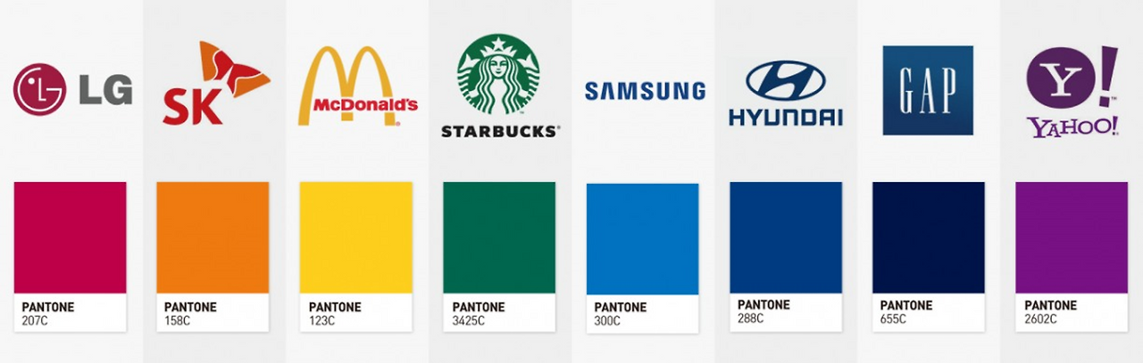 LG는 PANTONE 207C, 스타벅스는 PANTONE 3425C, 삼성은 PANTONE 300C, 현대차는 PANTONE 288C.여기서 C는 Coated를 의미하는 것으로 코팅한 유광 색상을 의미하고, 무광의 색상 칩은 Uncoated로 별도 제공되고 U로 표시된다.