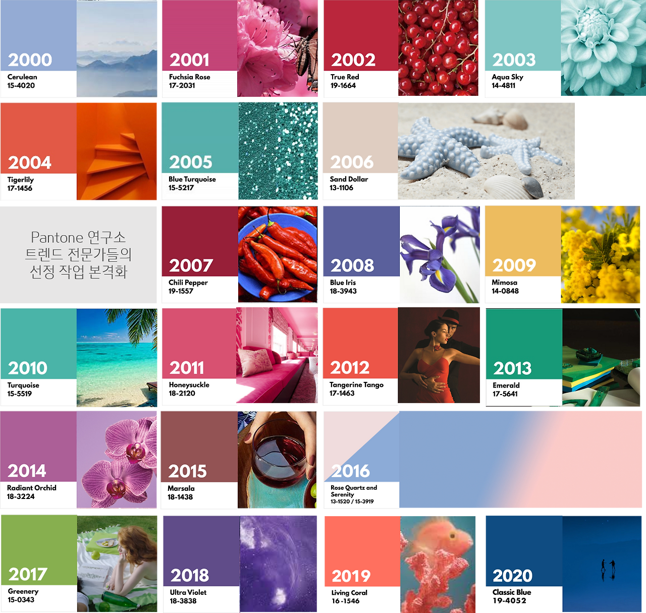 '올해의 컬러'는 2000년부터 선정 및 발표하기 시작했지만, 다양한 분석을 통한 색상의 의미부여가 본격화된 것은 2007년부터로 추측된다. 이는 2007년부터 색상 선정 이유와 배경에 대한 트렌드 선문가들의 설명이 시작됐기 때문이다.