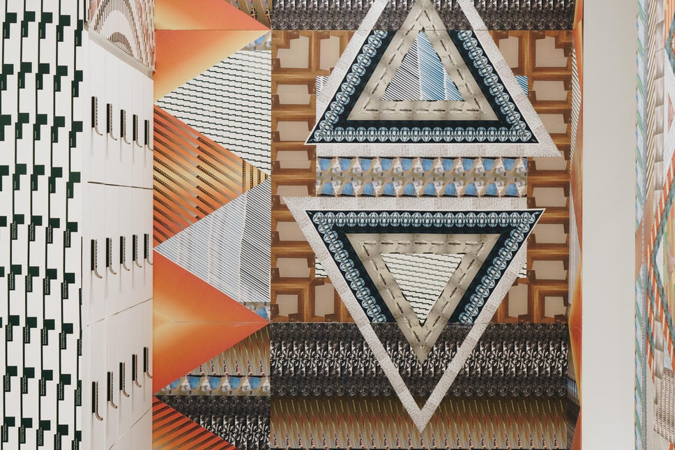 가운데 작품은 Ghost of a Dream이라는 듀오의 작품 'Yesterday is Here'로 MAAM의 새로운 로비의 그랜드 오프닝을 기념하기 위한 작품이다. 이 작품은 과거를 활용하여 미래를 만들어낸다는 취지로 30여 년의 MassArt의 전시회 카탈로그의 자료를 오리고 조합하고 붙이는 작업을 통해 만들어졌다고 한다. 주마등 (kaleidoscopic) 같은 미술관의 역사를 통해 MAAM의 미래를 이야기하는 경험을 창출하고 있다.