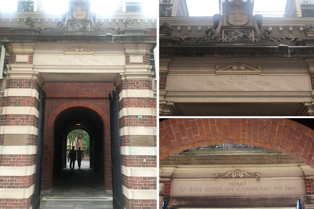 하버드 야드로 진입하는 입구에는 ENTER TO GROW IN WISDOM이 하버드 야드에서 밖으로 나가는 출구에는 DEPART TO SERVE BETTER THY COUNTRY AND THY KIND.