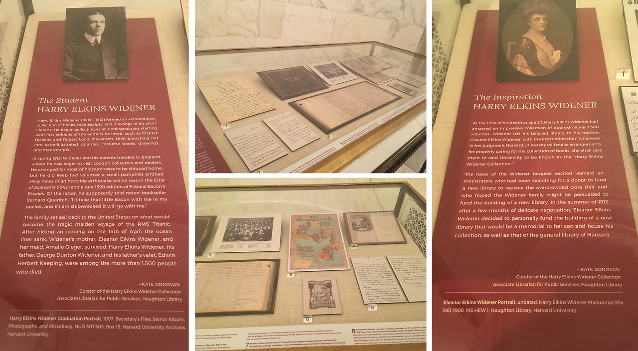 1912년 타이타닉 침몰로 사망한 하버드 졸업생 해리 엘킨스 와이드너 (Harry Elkins Widener)의 이름을 따서 지어진 와이드너 도서관. 해리의 어머니는 책을 좋아하던 아들을 기리기 위해 이 도서관을 지었고, 도서관의 구조를 바꾸거나 위치를 옮길 시 도서관 재산을 하버드에서 케임브리지 시로 넘기겠다고 엄포를 놓았다고 한다. 그래서 지어진 이후 현재까지 모습을 유지하고 있고, 도서관 내에 해리 엘킨스 와이드너의 유품을 전시하고 그를 기리는 작은 공간도 있다.