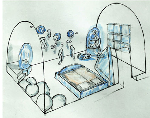 연필로 스케치를 하고 디지털 그래픽으로 변환 후, ICEHOTEL의 장비로 CNC가공을 거쳐 현장에서 수작업으로 조각을 끼워 맞췄다고 한다.