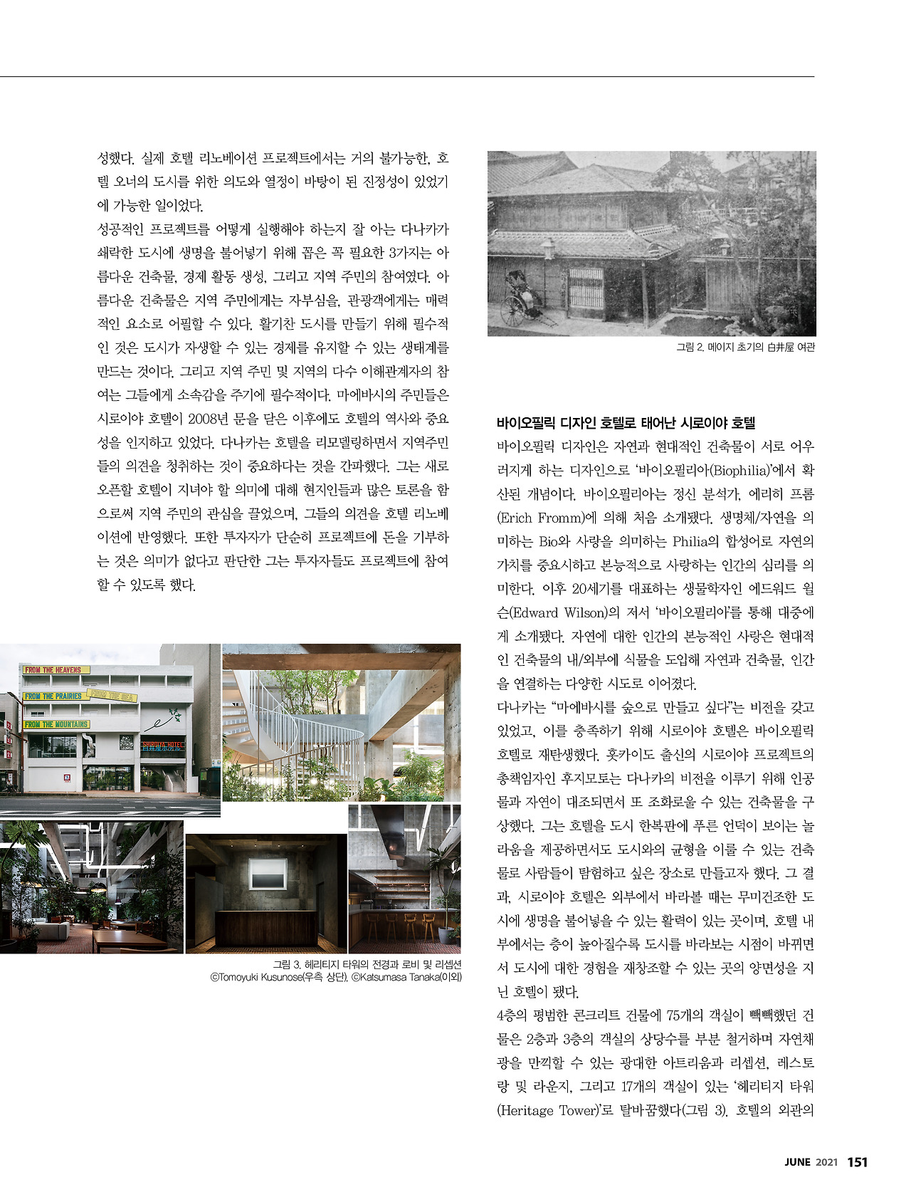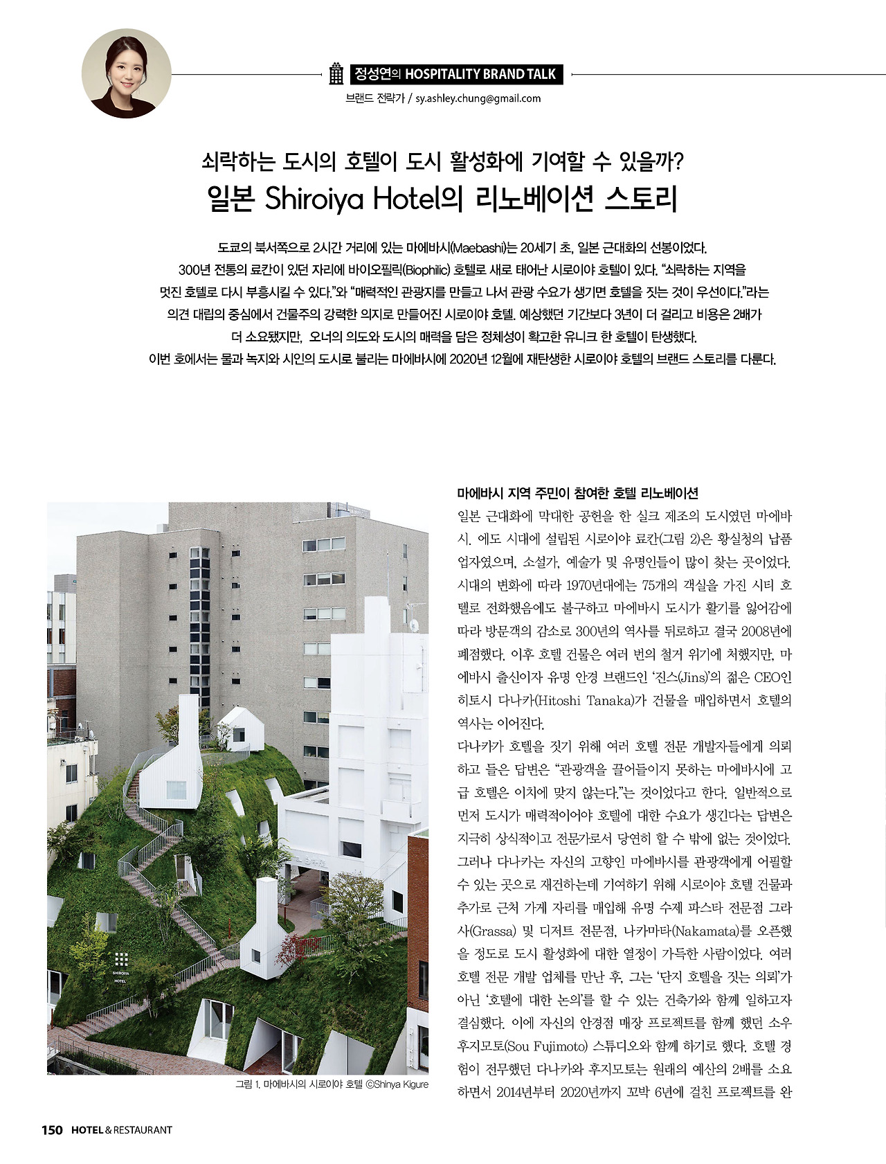 도쿄의 북서쪽으로 2시간 거리에 있는 마에바시(Maebashi)는 20세기 초, 일본 근대화의 선봉이었다. 300년 전통의 료칸이 있던 자리에 바이오필릭(Biophilic) 호텔로 새로 태어난 시로이야 호텔이 있다. “쇠락하는 지역을 멋진 호텔로 다시 부흥시킬 수 있다.”와 “매력적인 관광지를 만들고 나서 관광 수요가 생기면 호텔을 짓는 것이 우선이다.”라는 의견 대립의 중심에서 건물주의 강력한 의지로 만들어진 시로이야 호텔. 예상했던 기간보다 3년이 더 걸리고 비용은 2배가 더 소요됐지만, 오너의 의도와 도시의 매력을 담은 정체성이 확고한 유니크 한 호텔이 탄생했다. 이번 호에서는 물과 녹지와 시인의 도시로 불리는 마에바시에 2020년 12월에 재탄생한 시로이야 호텔의 브랜드 스토리를 다룬다.