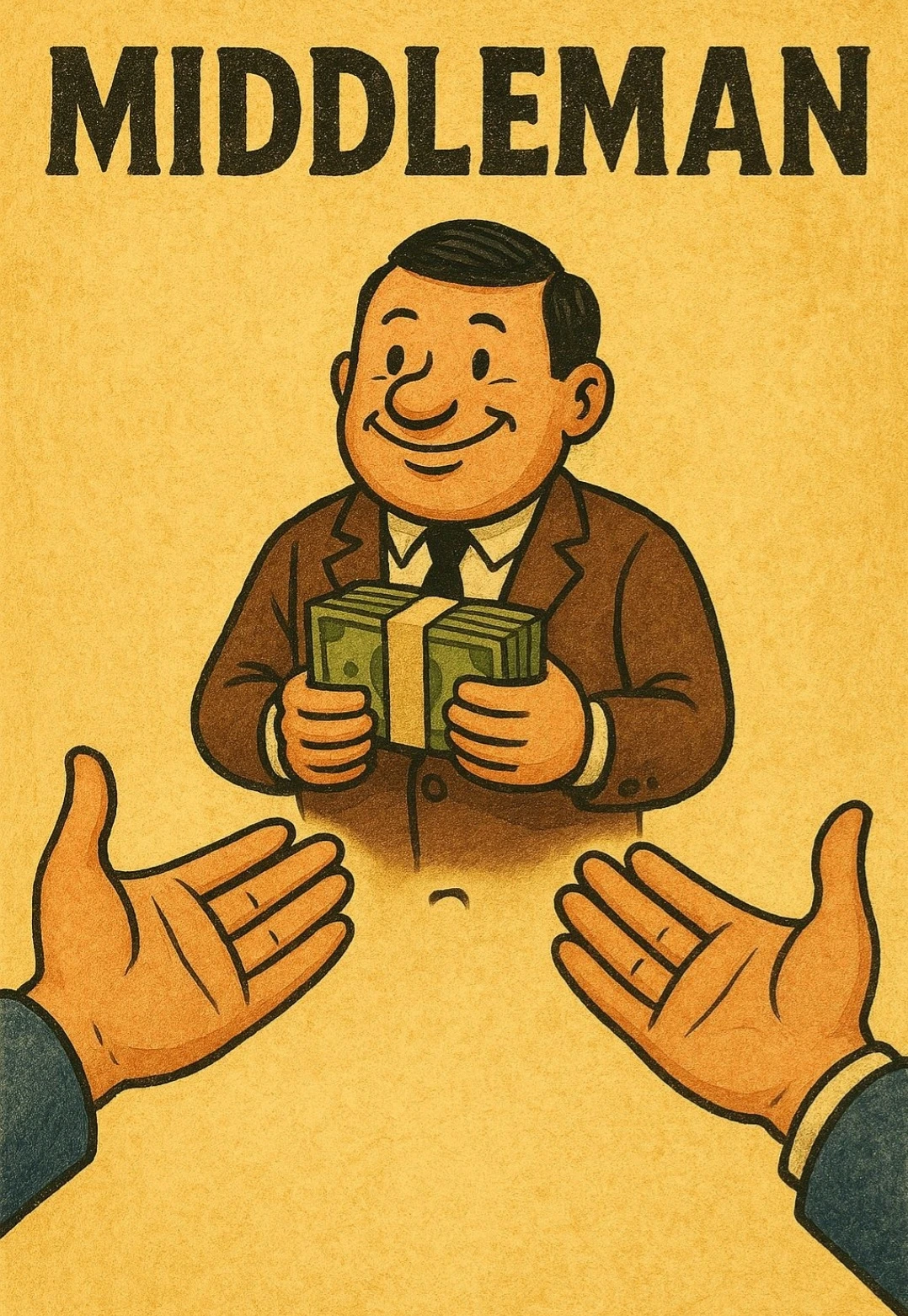 공인중개사, 자동차딜러, 변호사/세무사 등 전문직, 보험설계사, 펀드매니저, 주식브로커, 도매상, 수출입업자, 광고대행사 등 세상에는 수 많은 미들맨들이 있다.
