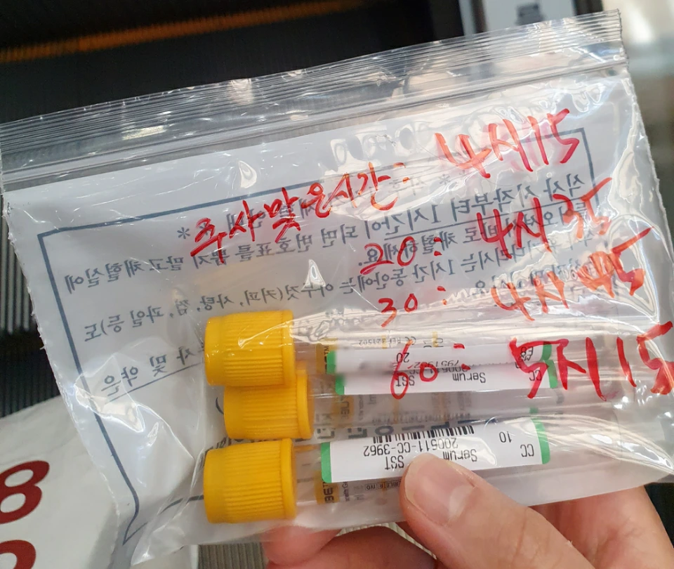 Cynacten이라는 약이 주입된 후 채혈해야 하는 시간이 정확히 지켜져야 의미가 있는 검사였으므로 1시간 동안 채혈 실안에서 기다리면서 알람을 맞춘 뒤 해당 시간마다 검사를 해야만 했다.