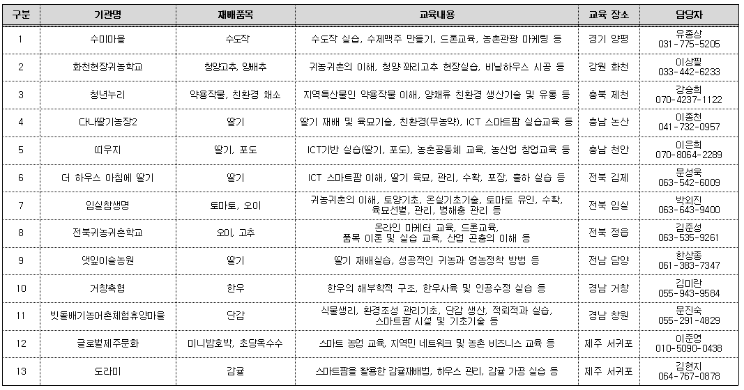 수미마을(경기 양평/ 수도작), 화천 현장 귀농학교(강원 화천/ 청양고추, 양배추), 청년 누리((충북 제천/ 약용작물, 친환경 채소), 다나 딸기농장(충남 논산/ 딸기), 띠우지(충남 천안/ 딸기, 포도), 더 하우스 아침에 딸기(전북 김제/ 딸기), 임실 참 생명(전북 임실/ 토마토, 오이), 전북 귀농귀촌학교(전북 정읍/ 오이, 고추) 댓잎 이슬 농원(전남 담양/ 딸기), 거창축협(경남 거창/ 한우), 빗돌배기 농어촌체험 휴양마을(경남 창원/ 단감), 글로벌 제주문화(제주 서귀포/ 미니 밤호박, 초당옥수수) 도라미(제주 서귀포/ 감귤)