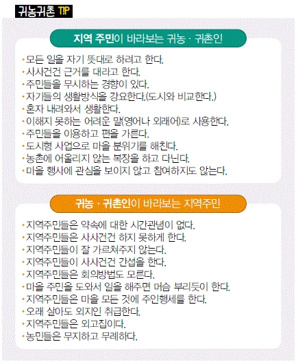 언제까지 지역주민들은 뒤로하고 귀농·귀촌인에게만 이해하고 감내하라고 할 것인가? 이젠 지역주민과 귀농·귀촌인이 함께 공존할 수 있는 교육과 다양한 프로그램이 필요한 시대이다.